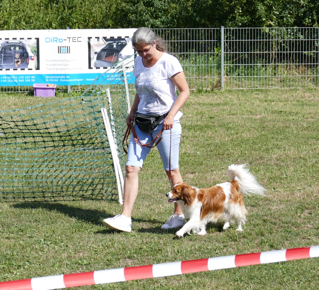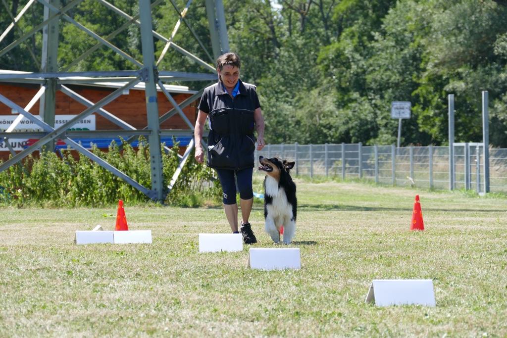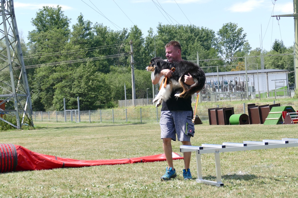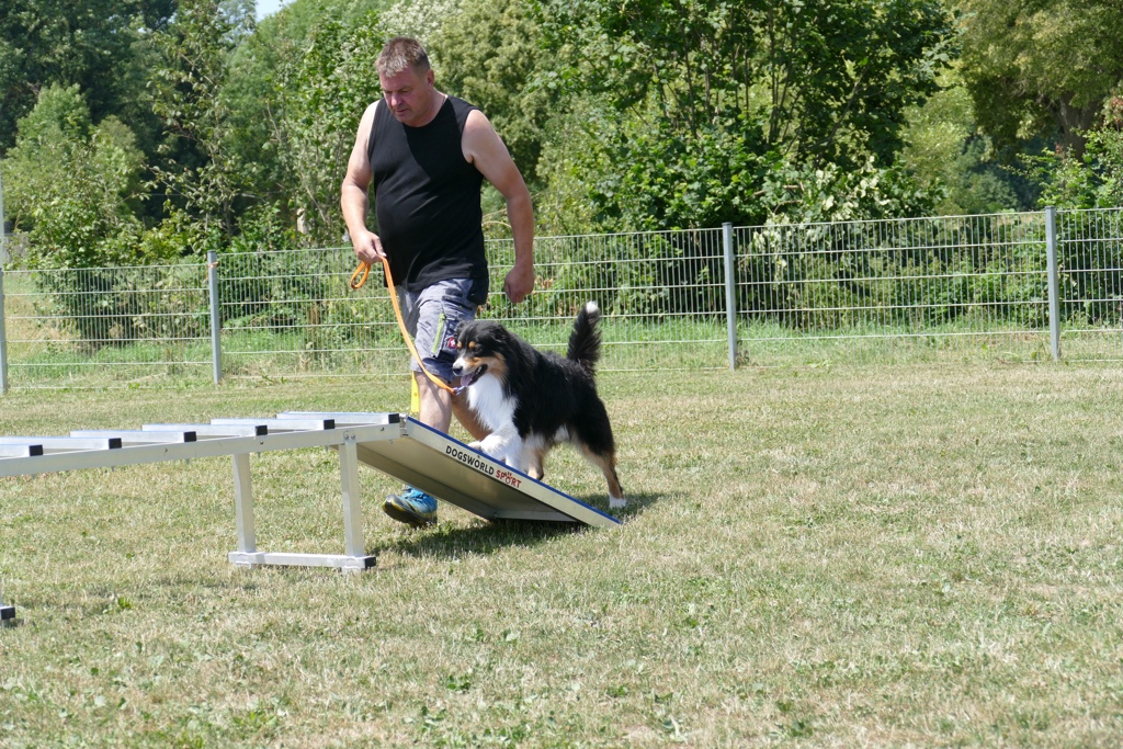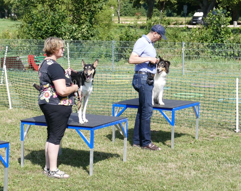Nun kommt unsere Überraschung des Tages. Nando, der eigentlich frisch aus dem Urlaub heute als Turnierbegleitung gar nicht da gewesen wäre, lief mit Agi-Neuling Andreas einen wunderbaren Parcours und zeigte, was Fleiß und Genauigkeit bringen. Heike und ihre 12jährige Espe können alles, den Heike trainiert die Anfänger und Espe ist immer dabei. Dem Alter geschuldet haben die beiden eine etwas abgespeckte Version gezeigt und den Slalom sowie die A-Wand weggelassen.