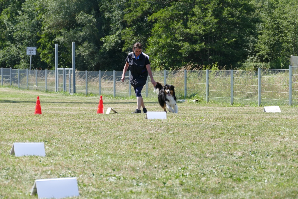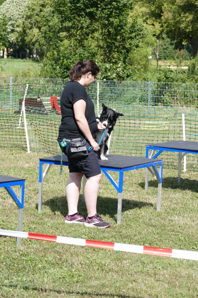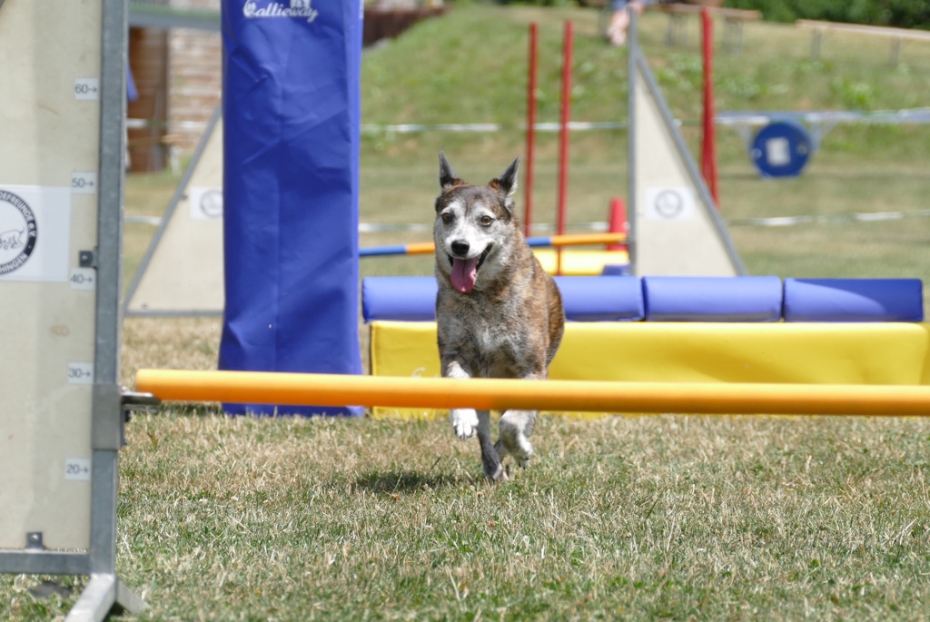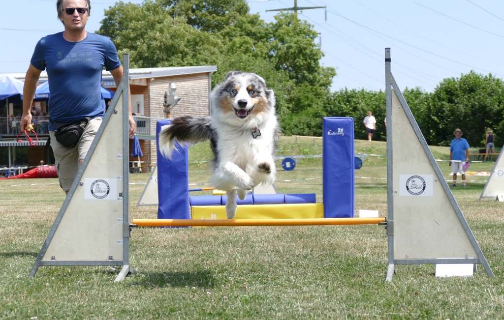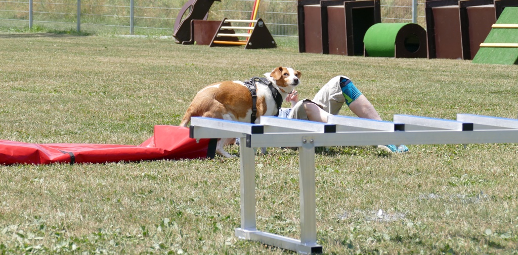 Nun kommt unsere Überraschung des Tages. Nando, der eigentlich frisch aus dem Urlaub heute als Turnierbegleitung gar nicht da gewesen wäre, lief mit Agi-Neuling Andreas einen wunderbaren Parcours und zeigte, was Fleiß und Genauigkeit bringen. Heike und ihre 12jährige Espe können alles, den Heike trainiert die Anfänger und Espe ist immer dabei. Dem Alter geschuldet haben die beiden eine etwas abgespeckte Version gezeigt und den Slalom sowie die A-Wand weggelassen.