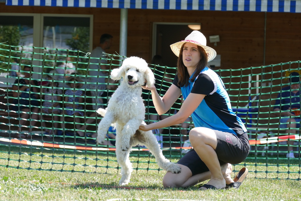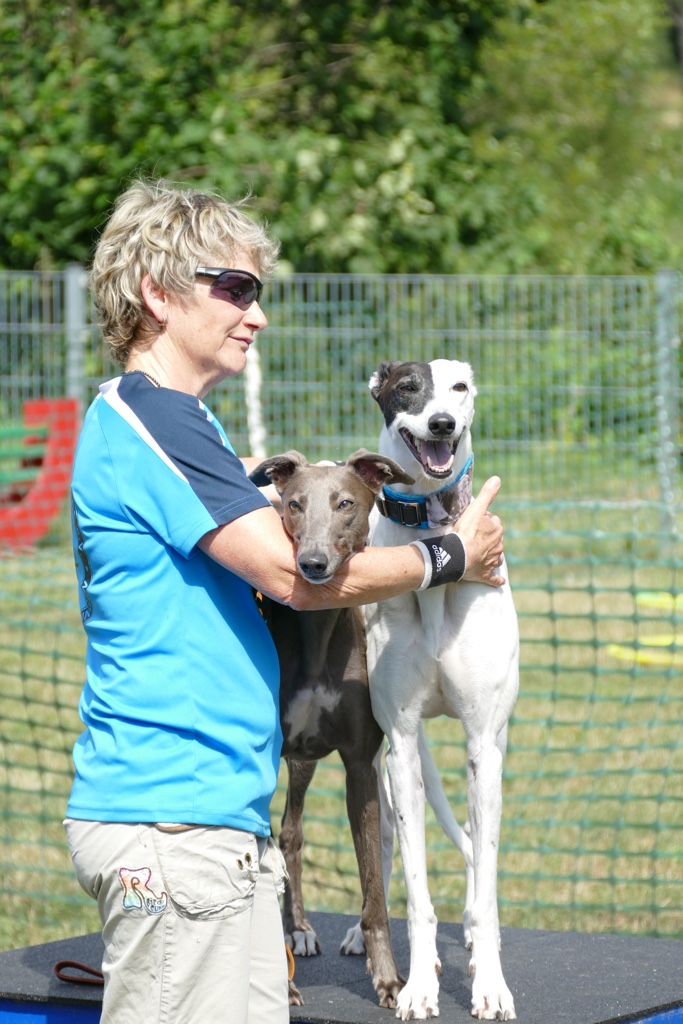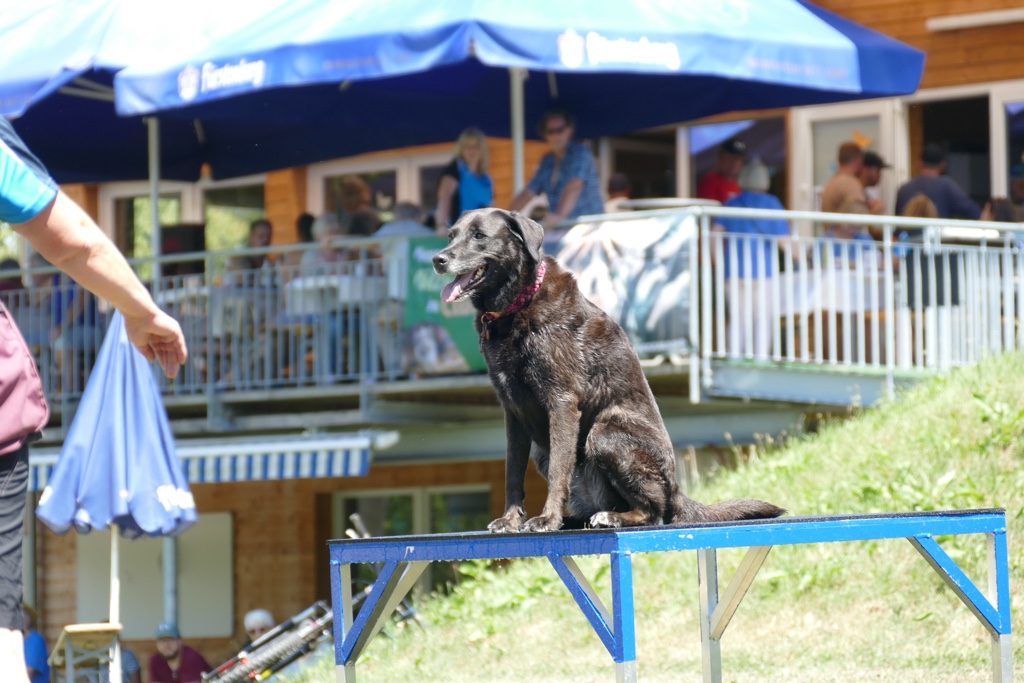 Den Abschluss bildete eine Gruppenübung, bei der beide Hunde gemeinsam um den Ring laufen und sich auch mal kreuzen. Die beiden kommunizierten immer schnell miteinander, wer jetzt wem den Vortritt lässt. Das geht nur durch kurze Blicke und schon sausten sie aneinander vorbei. Es war schön anzusehen, wie die Kommunikation zwischen den beiden funktionierte. Auch als Leni sich einmal zu Leon auf den Tisch verirrte, blieb er souverän sitzen und wartete, bis das Mädel wieder runtergehopst war.