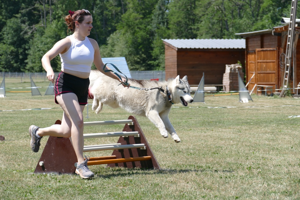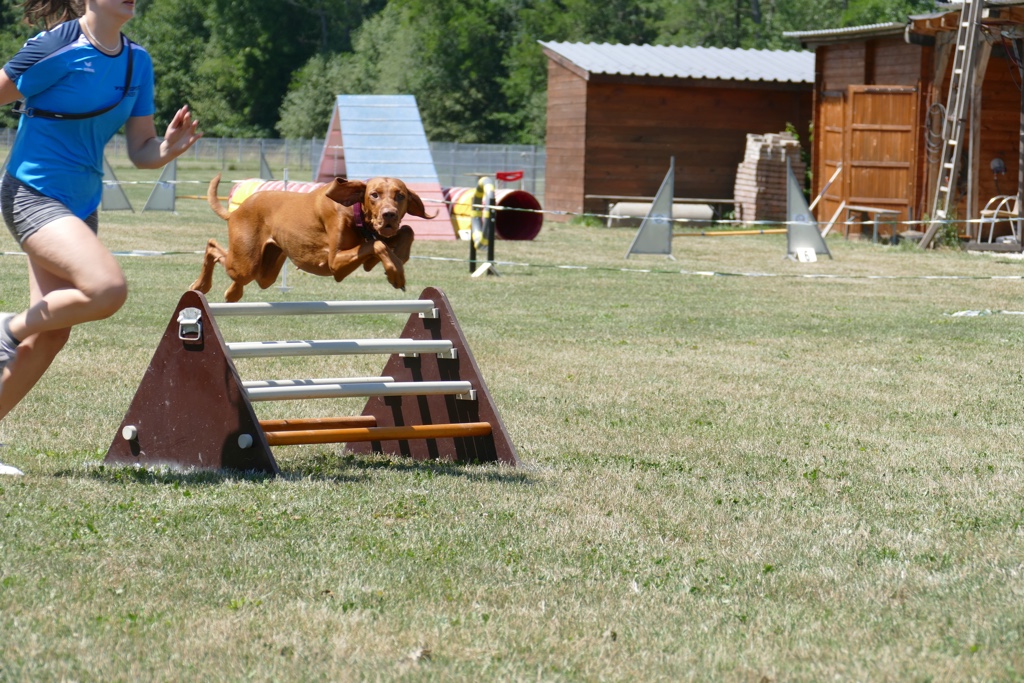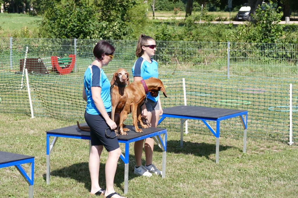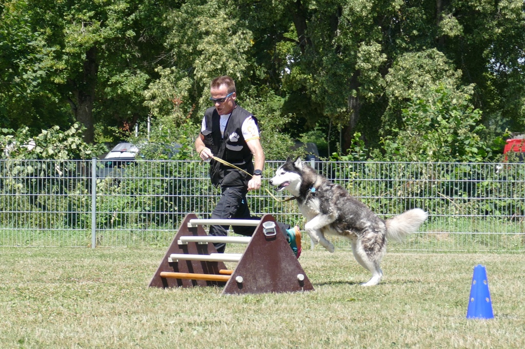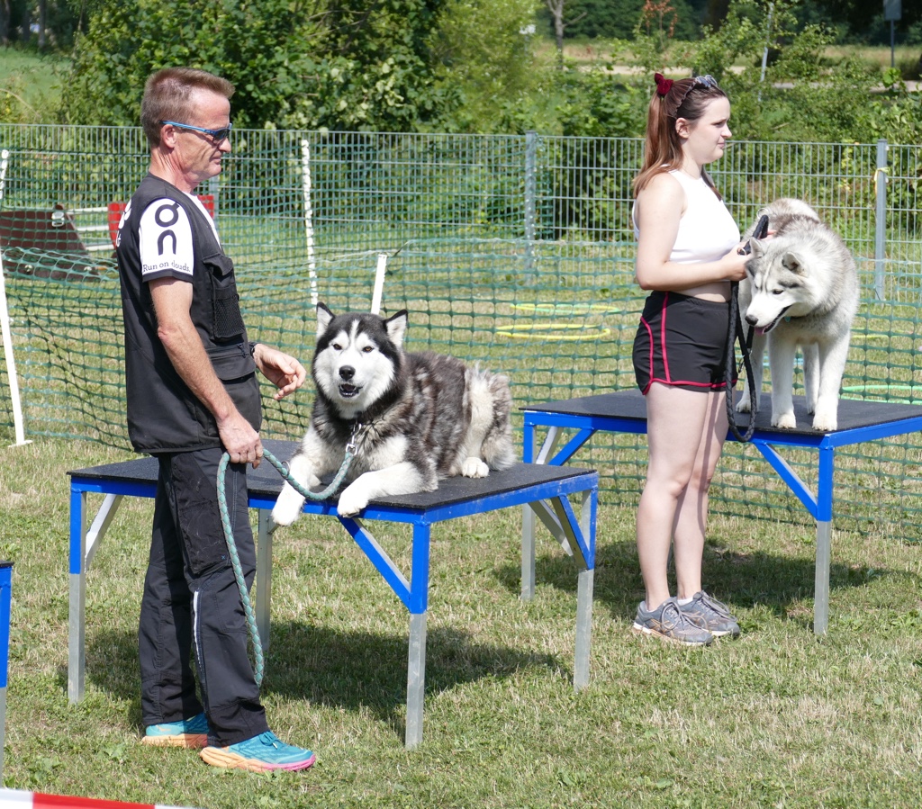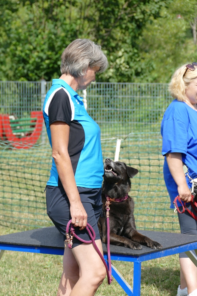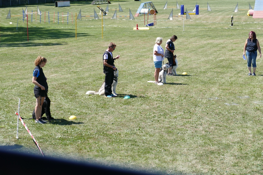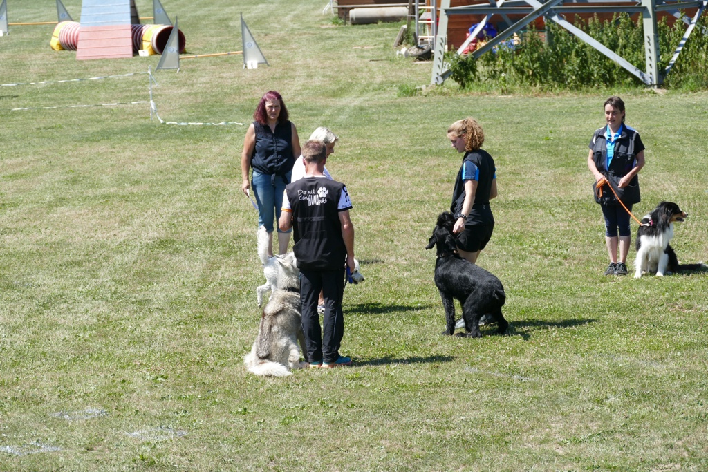 Am Start waren diesmal die beiden Viszlas Julie und Pheline, die beiden Huskys Jasper und Hero und Staff-Rüde Milow und Riesenschnauzerhündin Dina. Das Team Dina/Julie stahl allen die Show, da die beiden gemeinsam mit ihren beiden Frauchen bei beiden Durchläufen alle Hindernisse überquerten und die schnellste Zeit hatten. Die beiden Huskys haben zwar Spaß beim THS, aber suchen gerne auch mal einen Weg außen herum, was natürlich Zeit kostet und außerdem war es im Pelzmantel auch sehr heiß.