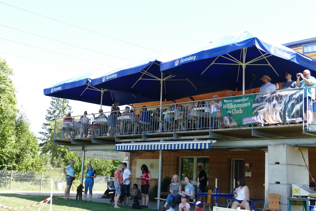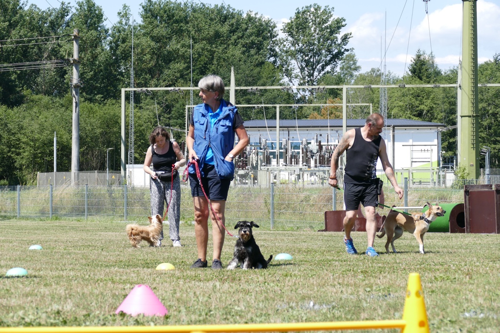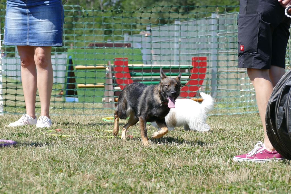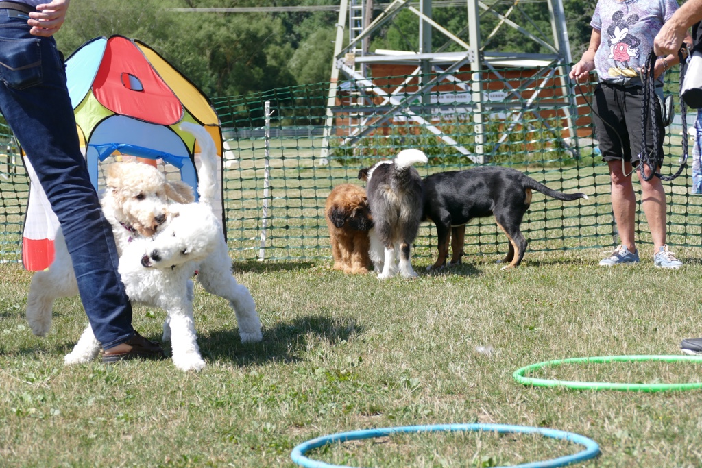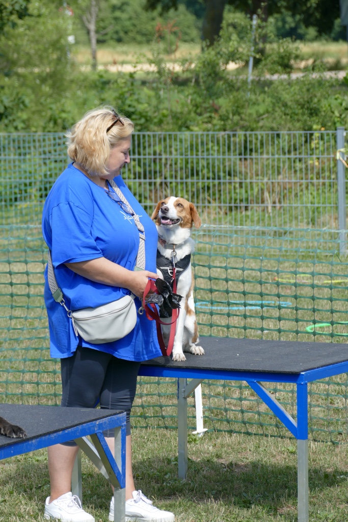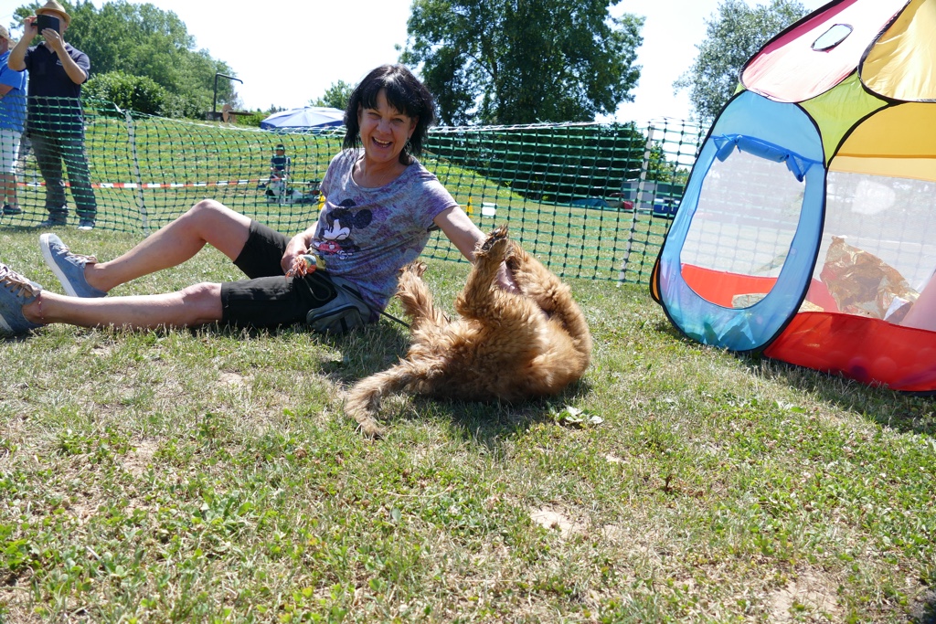 Zum Abschluss und für alle Zuschauer hatten wir einen Mitmachparcours aufgebaut, bei dem die Zuschauer mit ihren Hunden 5 Stationen mit Spielen, Eierlaufen, einem Hunderennen und verschiedenen leichten Mut- oder Geschicklichkeitsübungen absolvieren konnten. Natürlich wurde der Parcours mit viel Freude und Elan angenommen und als gegen halb vier plötzlich ein frischer Wind aufkam und einige Wölkchen die Sonne etwas ausbremste, gab es nochmal einen kleinen Ansturm, da nun endlich wieder durchgeatmet werden konnte.
