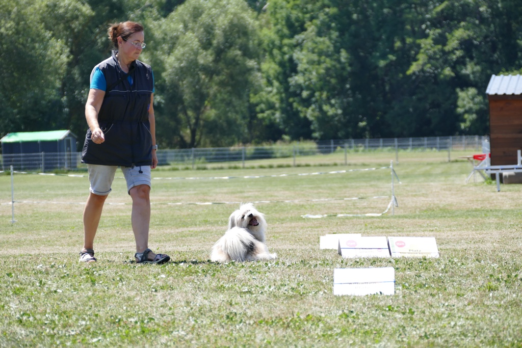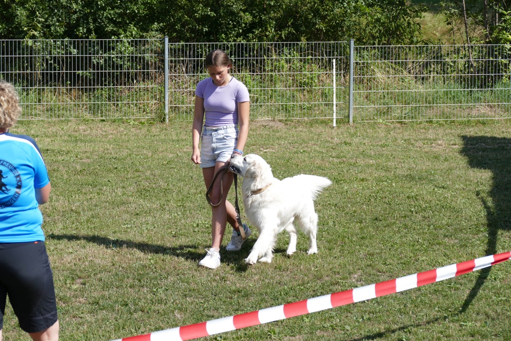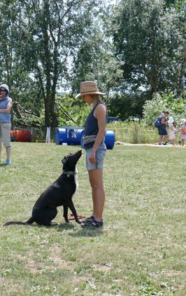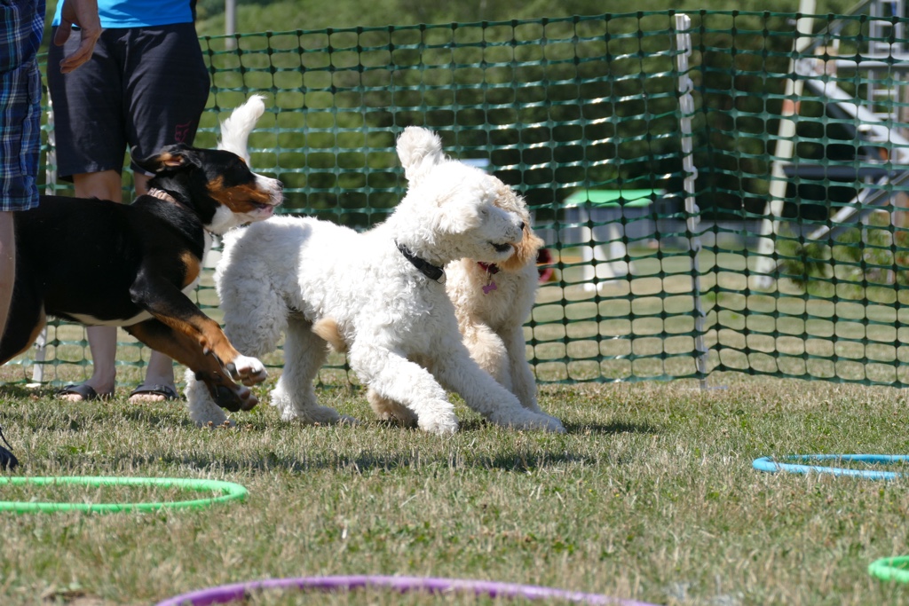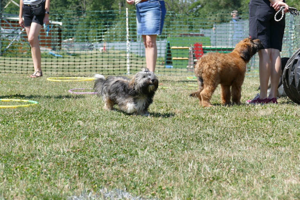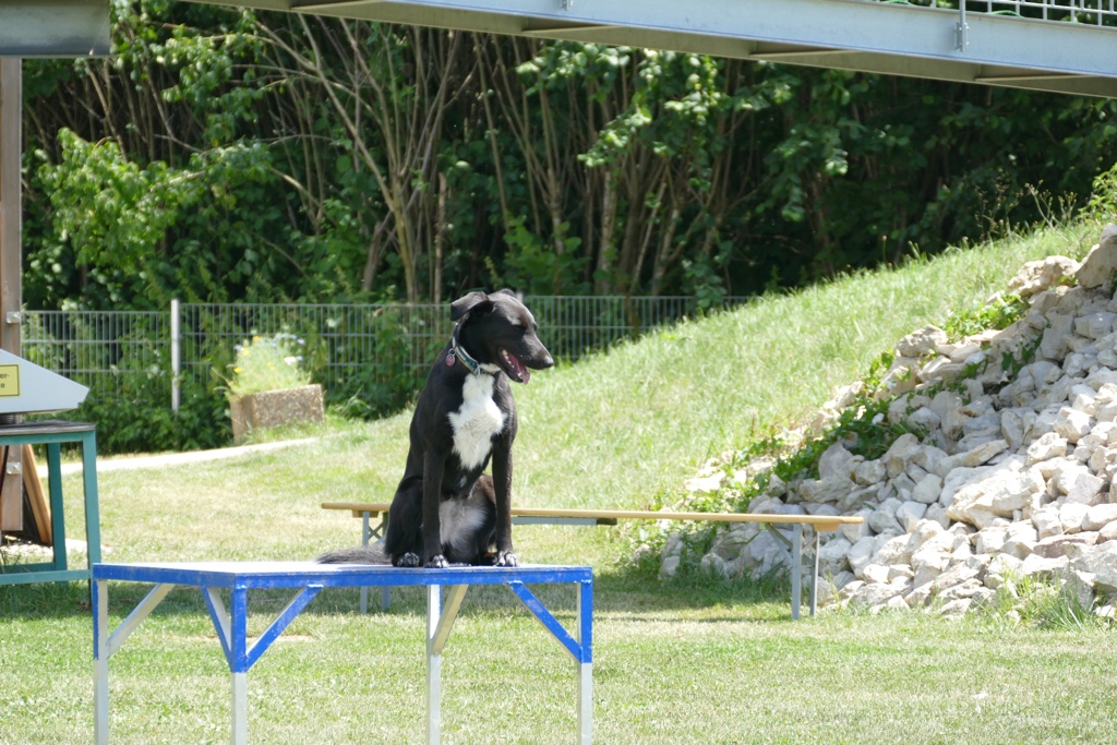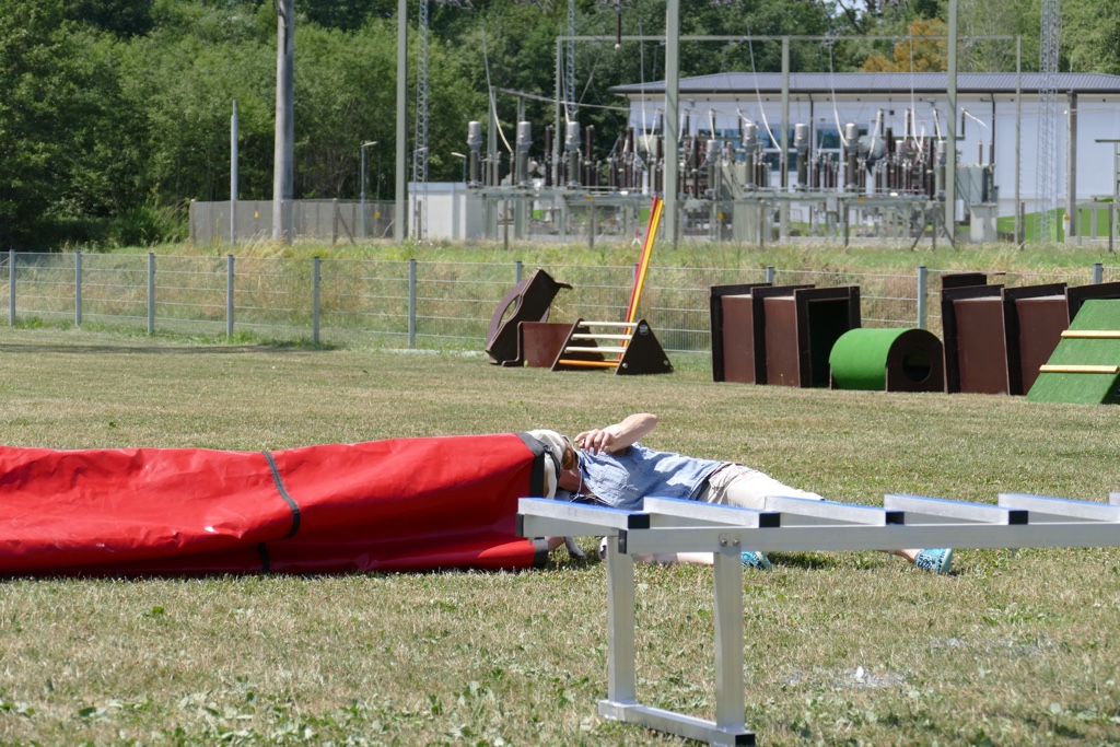 Zum Abschluss und für alle Zuschauer hatten wir einen Mitmachparcours aufgebaut, bei dem die Zuschauer mit ihren Hunden 5 Stationen mit Spielen, Eierlaufen, einem Hunderennen und verschiedenen leichten Mut- oder Geschicklichkeitsübungen absolvieren konnten. Natürlich wurde der Parcours mit viel Freude und Elan angenommen und als gegen halb vier plötzlich ein frischer Wind aufkam und einige Wölkchen die Sonne etwas ausbremste, gab es nochmal einen kleinen Ansturm, da nun endlich wieder durchgeatmet werden konnte.