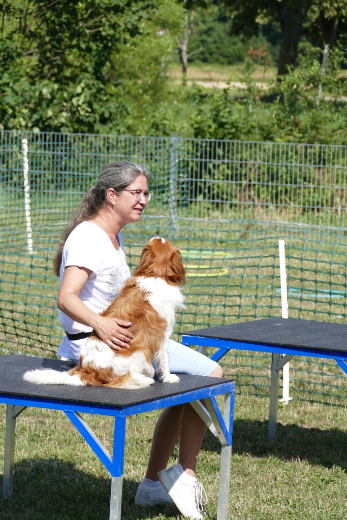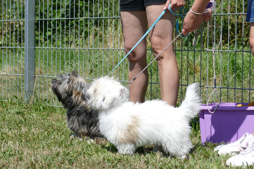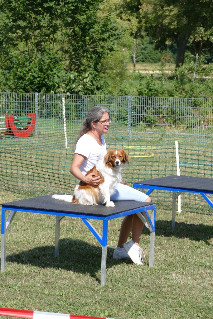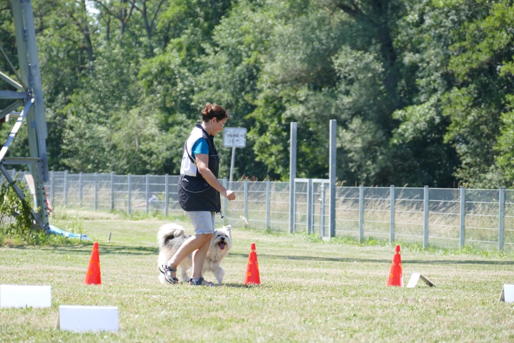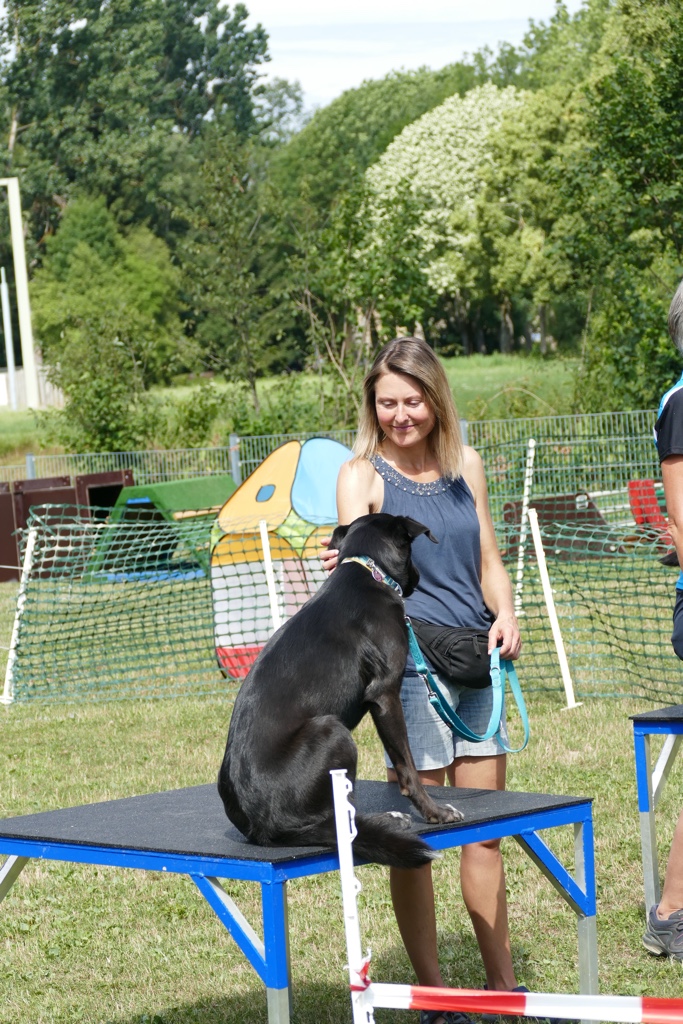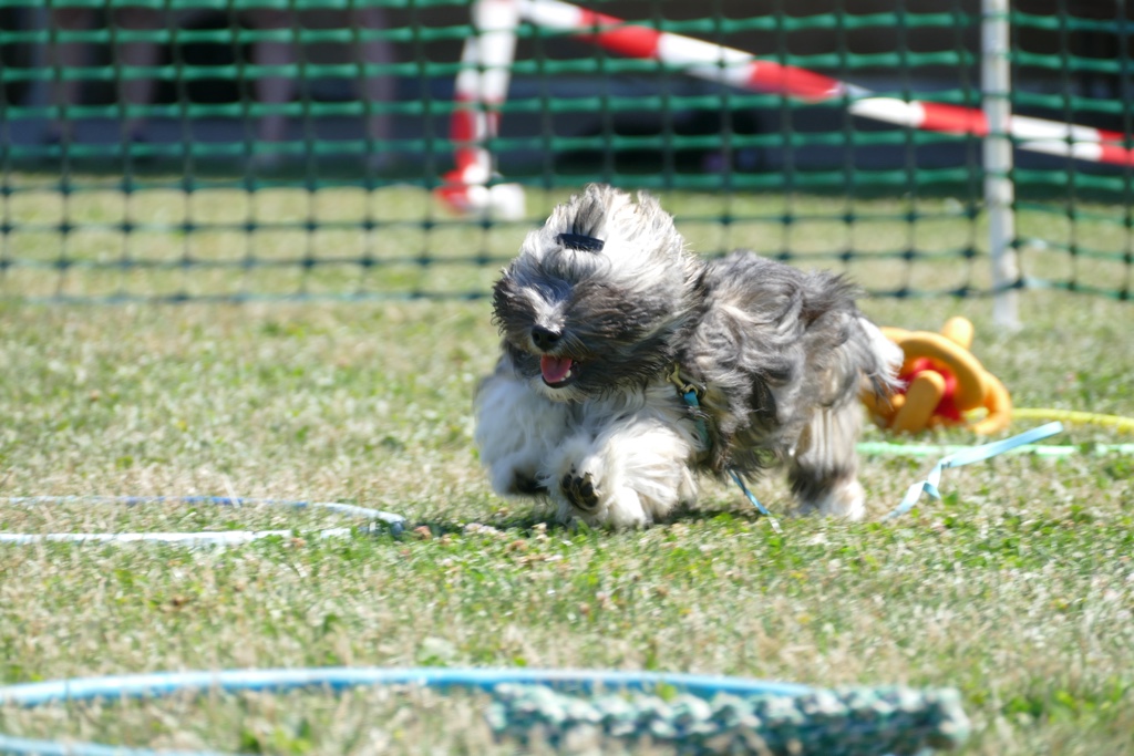Zum Abschluss und für alle Zuschauer hatten wir einen Mitmachparcours aufgebaut, bei dem die Zuschauer mit ihren Hunden 5 Stationen mit Spielen, Eierlaufen, einem Hunderennen und verschiedenen leichten Mut- oder Geschicklichkeitsübungen absolvieren konnten. Natürlich wurde der Parcours mit viel Freude und Elan angenommen und als gegen halb vier plötzlich ein frischer Wind aufkam und einige Wölkchen die Sonne etwas ausbremste, gab es nochmal einen kleinen Ansturm, da nun endlich wieder durchgeatmet werden konnte.