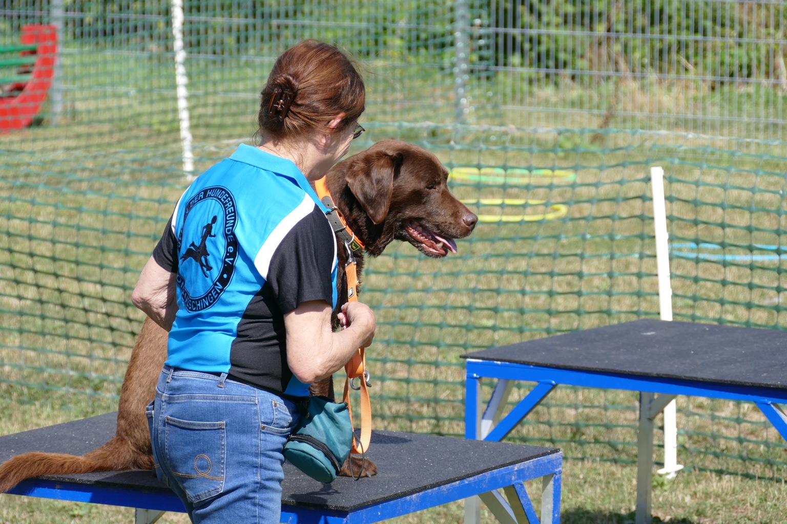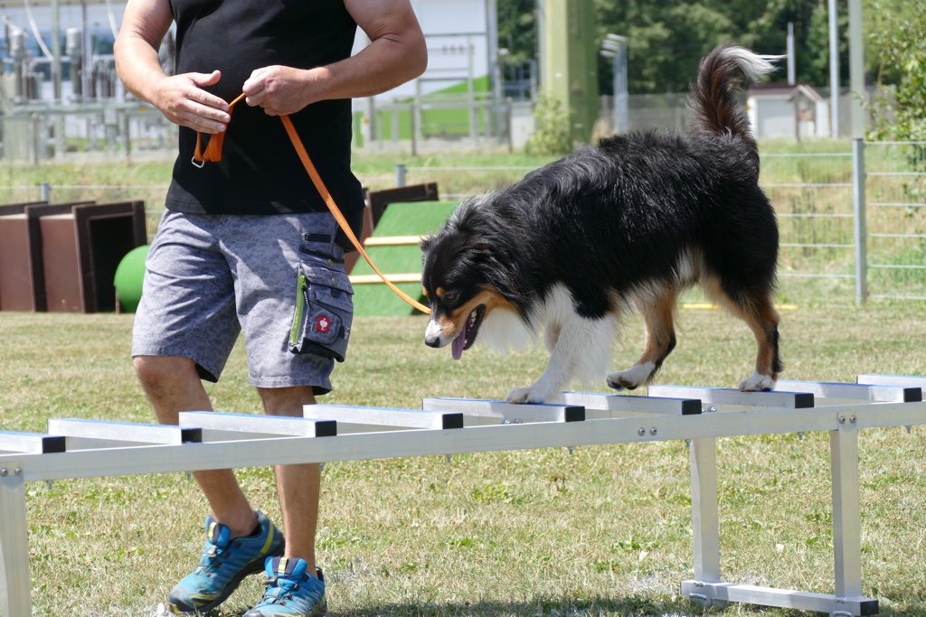 Im Anschluss zeigte die Rettungshundegruppe ihr bereits gelerntes. Die Gruppe existiert erst seit diesem Jahr und ist aus der Mantrailinggruppe entstanden, da sie sich für weiteres Training an den Geräten entschieden haben. Der Rettungshundesport ist aus der Rettungshundearbeit entstanden und die Geräte sind den verschiedenen Elementen, die bei der Flächen- oder Trümmersuche die Suche erschweren entstanden. So muss ein Hund sich auch von seinem Menschen an einen Helfer übergeben lassen, der ihn weiter trägt oder über einen wackelnden Steg oder sogar eine Leiter gehen.