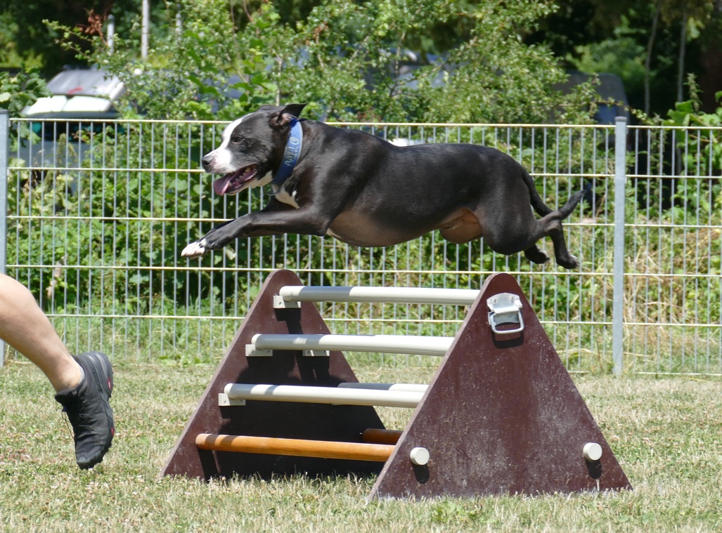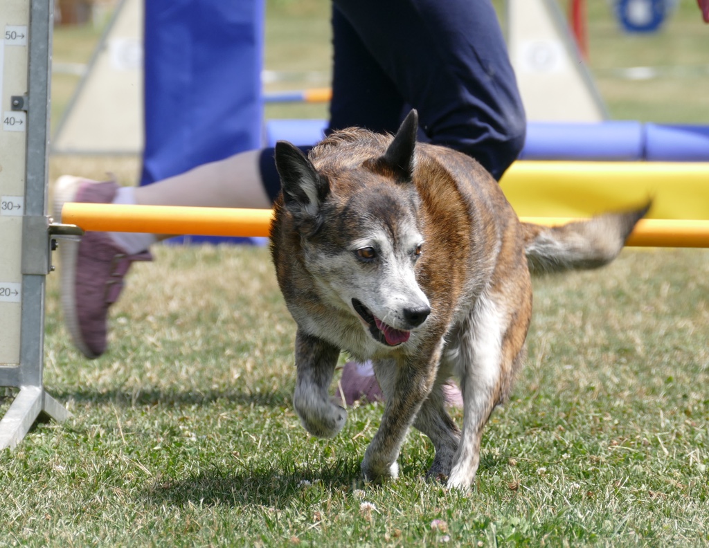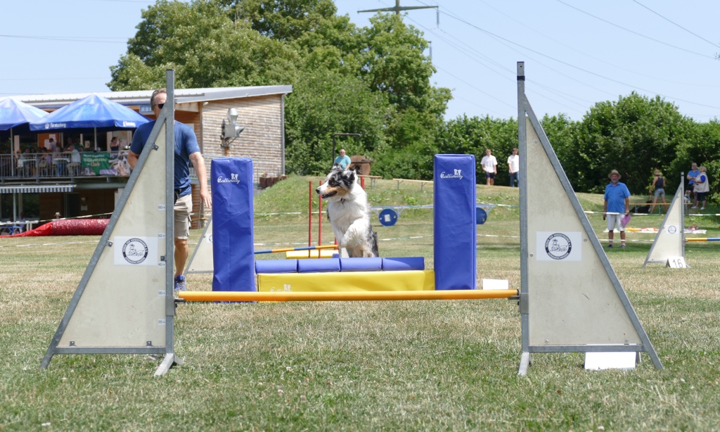 Hab ich gesagt, dass es schnell wird? Wir können hier die Latte noch höher legen. Im Agility zählt Präzision und Geschwindigkeit. Es ist nicht notwendig, dass der Hund und der Mensch die Hindernisse gemeinsam bewältigen. Eigentlich kann der Mensch irgendwo stehen, er muss seinem Hund nur vermitteln, dass er die Hindernisse in der vorgegebenen Reihenfolge überqueren muss. Die Reihenfolge ist allein Sache des Leistungsrichters und so ist jeder Parcours eine Herausforderung für sich.