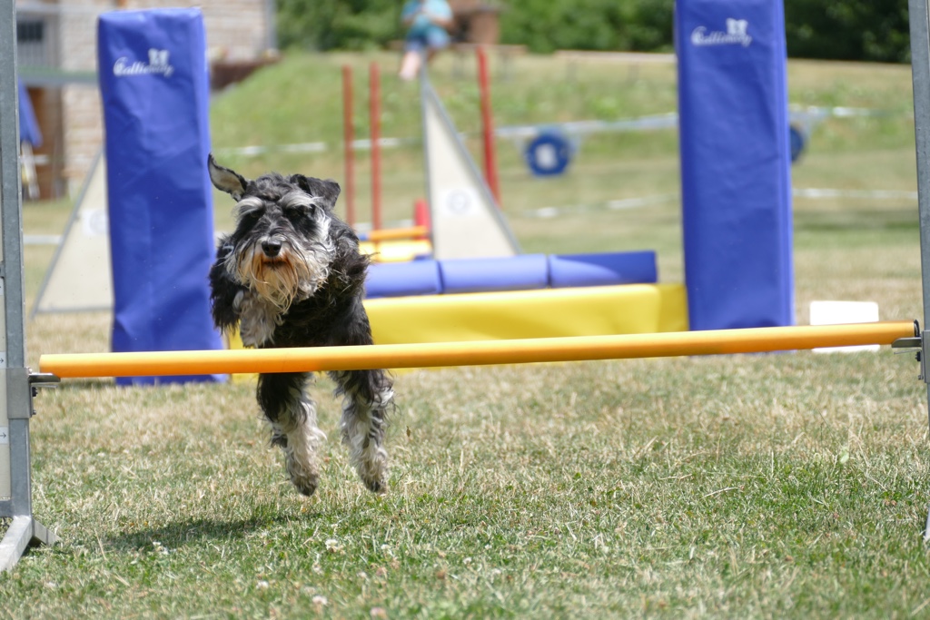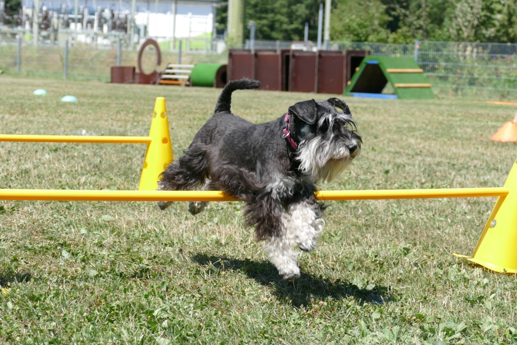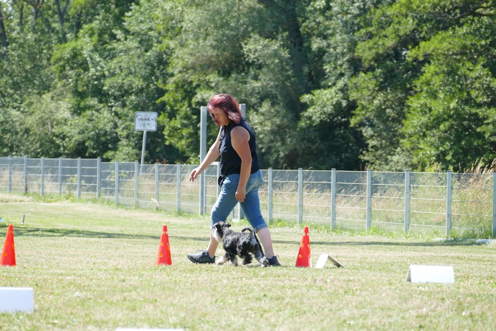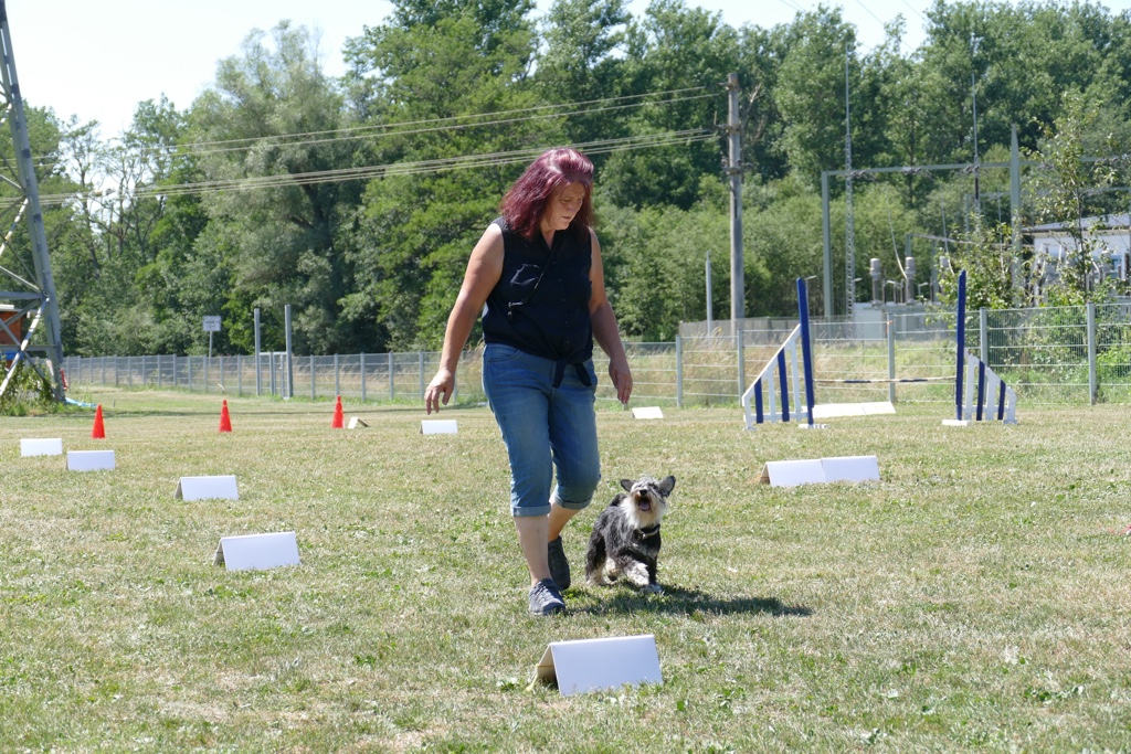 Den Anfang machte Hannah mit ihrem Border-Mädchen Maid, die den Parcours zur Hälfte absolvierte und da Maid erst seit knapp 1 Monat Agi trainiert, natürlich sehr gemütlich, um Verletzungen vorzubeugen. Der kleine Balou mit Frauchen Nadja kann schon den gesamten Parcours, aber trotz Nadjas Turniererfahrung braucht Balou noch viel Führung. Schließlich ist nicht er der erfahrene Teil des Teams. Im Anschluss wurde es gleich schneller, denn die kleine Zwergschnauzerhündin Nelly ist schon ein bisschen dabei und gemeinsam mit Frauchen Andrea hat sie die erste Hälfte des Parcours perfekt laufen können.