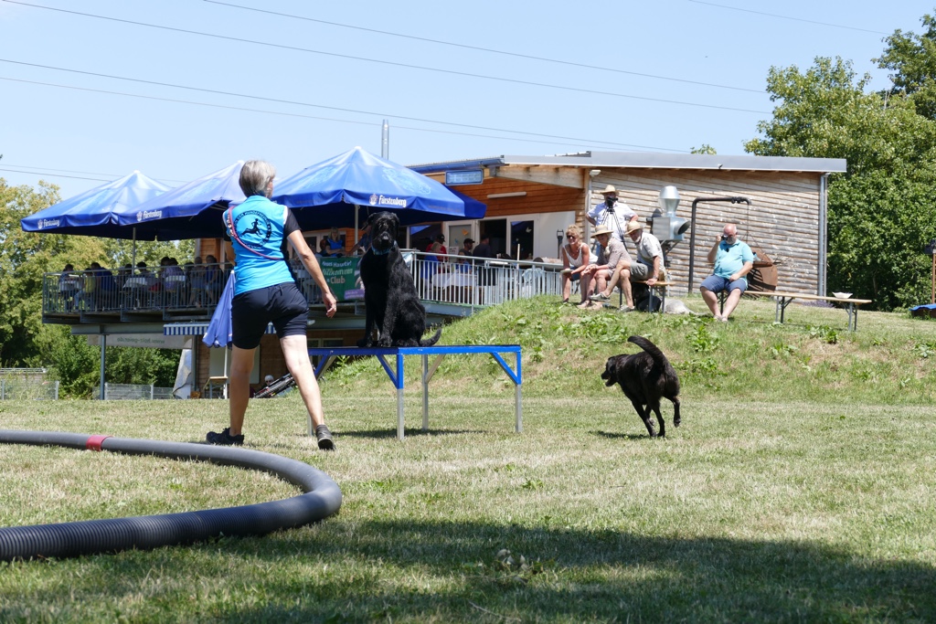 Nun wird’s schnell. Die Turnierhundesportgruppe hatte einen sogenannten Shorty aufgebaut und je 2 Teams laufen eine Art Hindernisstaffellauf gegen die Konkurrenz. Beim Shorty startet das eine Team in die eine Richtung und nach überqueren der Ziellinie darf das andere Team in die entgegengesetzte Richtung laufen. Es kommt auf Zeit und die gemeinsame Überwindung des Hindernisses an. Der Hund muss drüber, nicht der Mensch, aber sie müssen beide auf einer Höhe sein. Also heißt es für den Menschen, dass er sehr schnell sein muss, denn der tierische Begleiter hat Allrad und Vierpfotenantrieb. 🙂 Trainer Michael Heinrich hat eine sehr gute und engagierte Turniergruppe am Start, die sich auf Turnieren gut präsentieren kann.