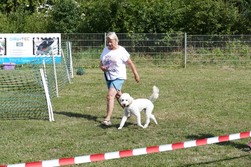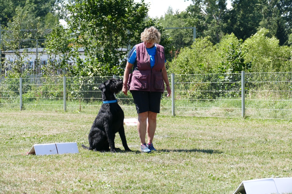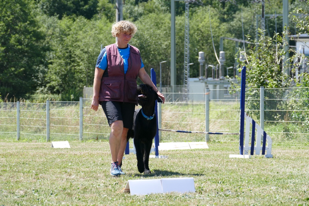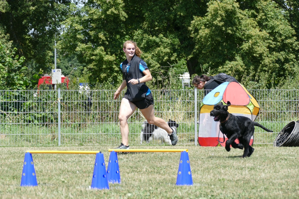 Riesenschnauzer Leon hatte seinen letzten Auftritt des Tages und zeigte in beeindruckender Weise, was er für ein Multitalent ist. Leon war schnell und präzise und Simone konnte sehr flott gehen, was für ein Turnier optimal gewesen wäre. Die beiden starten in der Klasse 2. Den Abschluss bildete die Trainerin Ines Wegen mit ihrer Leni, die unglaublich fröhlich und energiegeladen neben Ines herhopste und wedelte. Aber trotz allem Gewusel und ihrer Gummiballart zeigten die beiden einen fehlerfreien und sehr schönen Lauf.