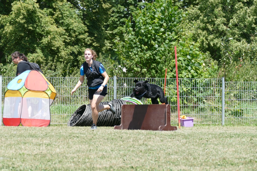 Riesenschnauzer Leon trabte fröhlich außen herum, während Simone im Kreis, die von Trainerin Nicole Ludwig angesagten Kommandos an ihn weiter gab. So sprang er auf den Tisch, lief durch den Tunnel, umrundete eine Stange bzw. ein kurzes Einzelstück des Rings oder überquerte den Sprung und das nur durch Zeichen- bzw. Wortkommandos. Die quirlige Leni flitzte außen herum und musste in einer deutlich höheren Frequenz von Frauchen Ines ihre Kommandos erhalten.
