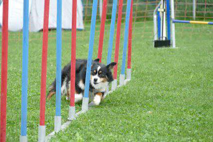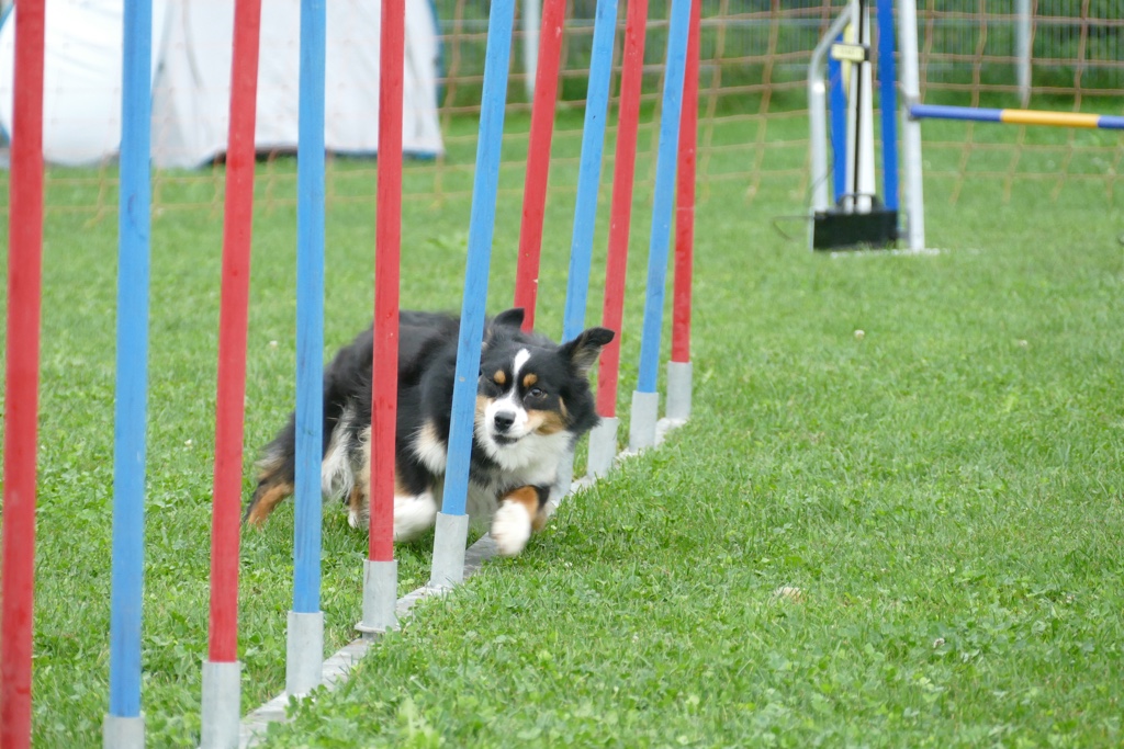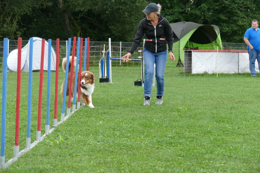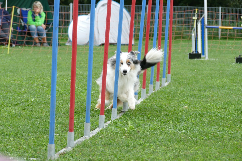 Den Abschluss unserer Donaueschinger Starter bildete Petra mit ihrer Yumi in A1 large, wo generell eines der größten Starterfelder ist. Die beiden hatten nun fast 9 Wochen Verletzungspause und es war der erste Start für diese Saison. Da Yumi dazu neigt, erstmal der Richterin und den netten Menschen am Richtertisch ein freundliches Guten Morgen zu wünschen, ging Petra zuerst einmal mit ihrem eigenwilligen Hundemädchen zu allen Funktionären, damit diese erste Begeisterung für die sie umgebenden Menschen gedämpft wurde. Doch Yumi wäre nicht Yumi, wenn ihr nicht was Neues einfallen würde. Diesmal beschloss sie, dass der Slalom schon zwei Stangen früher enden sollte und ließ sich durch nichts von dieser Meinung abbringen, egal wie sehr Petra auf die „neue“ Länge des Slaloms bestand.