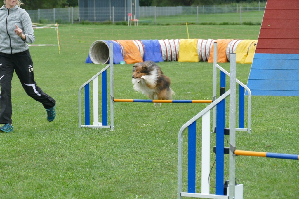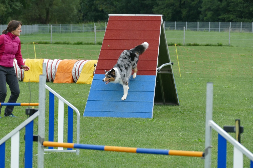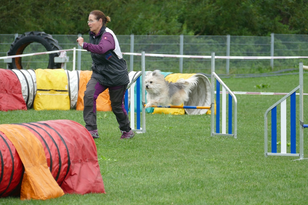 Die Hunde waren mit viel Begeisterung dabei und auch die Zuschauer hatten viel Spaß und haben mitgelitten. Leider setzte während des zweiten Durchgangs von Klasse 1 der versprochene Regen ein und so wurde es ziemlich ungemütlich. Wir hätten es schaffen können, trocken durchzukommen, leider mussten die ganzen Starter auf einen Hund aus der Ausstellung warten und somit verzögerte sich alles um rund 40 Minuten. Sehr schade für alle. Die Richterin baute daher den Parcours der Klasse 2 um und stellte einen wetterangemessenen Parcours, da der ursprünglich geplante bei der Sintflut nicht zu bewältigen gewesen wäre. Der Regen fiel in dichten Reihen und bei der Ausstellung musste sogar unterbrochen werden, da sonst kein fluffiges Fell, sondern nur noch nasse Hunde zu bewerten gewesen wären.