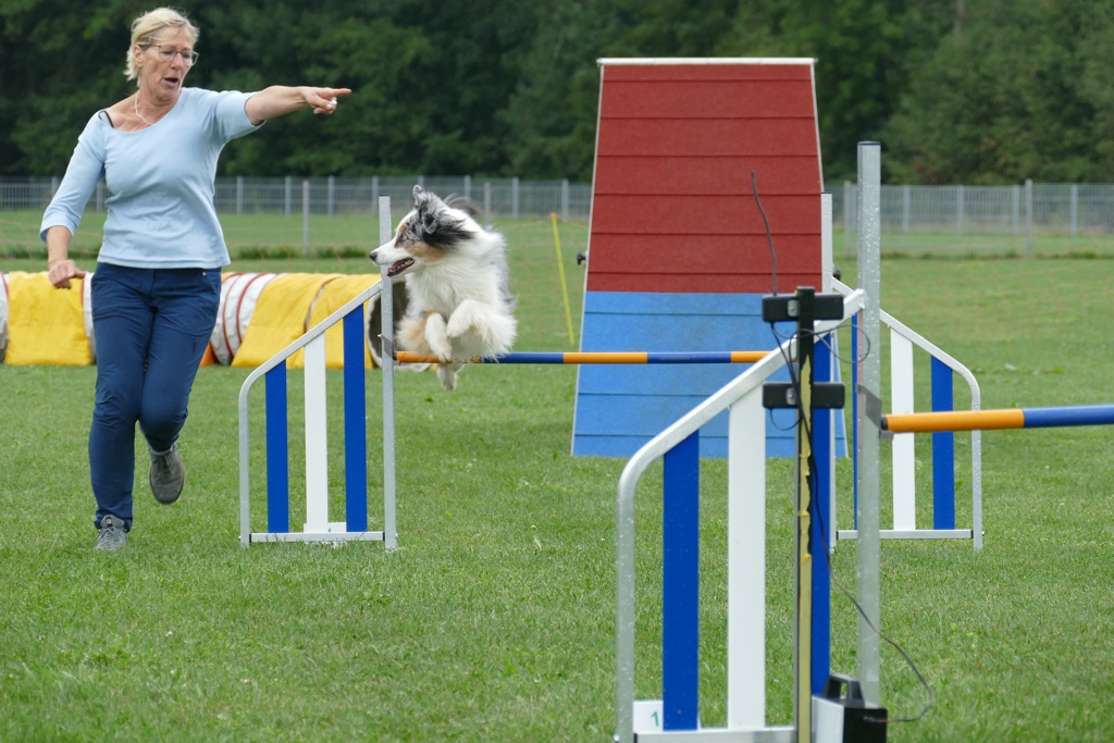 Mit den Beginnern ging es gleich für 3 Donaueschinger zur Sache. Nando litt unter starkem Lampenfieber und außerdem war alles so interessant und ständig wollte Petra irgendwas von ihm. Er hatte große Konzentrationsprobleme und dann lief Petra auch noch verkehrt durch die Acht und nun waren alle beide so durcheinander, dass sie froh waren, als dieses schöne Schild mit der Aufschrift „Ziel“ vor ihnen auftauchte. Uff. Petra nahm es mit Humor und meinte, dass sie ja noch zwei Hunde zum Ausgleich hat.