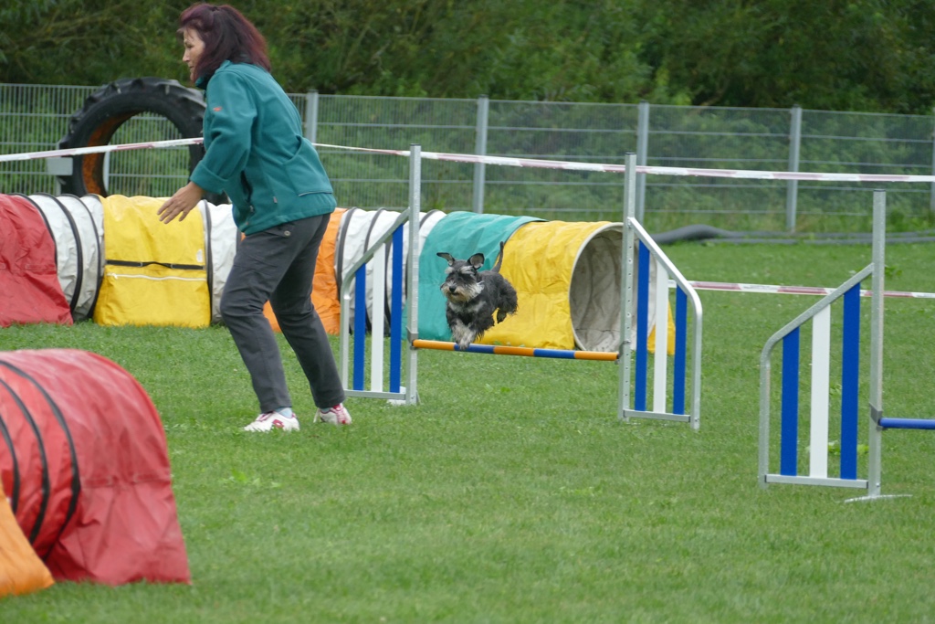 Pünktlich zum ersten Start setzte der Regen ein und sorgte für jede Menge Nervenkitzel, den der Rasen und die Geräte wurden rutschig. Den Anfang machte Andrea mit ihrer Nelly in der A0 Small. Es war der allererste Start für die beiden und dementsprechend nervös war Andrea. Bisher war sie mit ihren Riesenschnauzern im Turnierhundesport gestartet und Nelly ist ihr erster Zwergschnauzer und Agility trainieren die beiden erst seit etwa zwei Jahren, wovon Nelly auch noch ein paar Monate Welpenpause einlegen musste. Aber die ganze Aufregung war nicht nötig, denn die beiden absolvierten einen wunderbaren fehlerfreien Lauf. Nelly denkt mit und achtet sehr auf Andrea, also konnte sie auch eine kleine Unsicherheit und späte Ansage locker ausgleichen, da sie sich schon richtig positioniert hatte. Somit gewannen die beiden ihren ersten Lauf auf Anhieb. Auch in der Second Chance lief alles fabelhaft und die beiden hatten ihre ersten Pünktchen für den Aufstieg in der Tasche. Was für ein tolles neues Agility-Team.