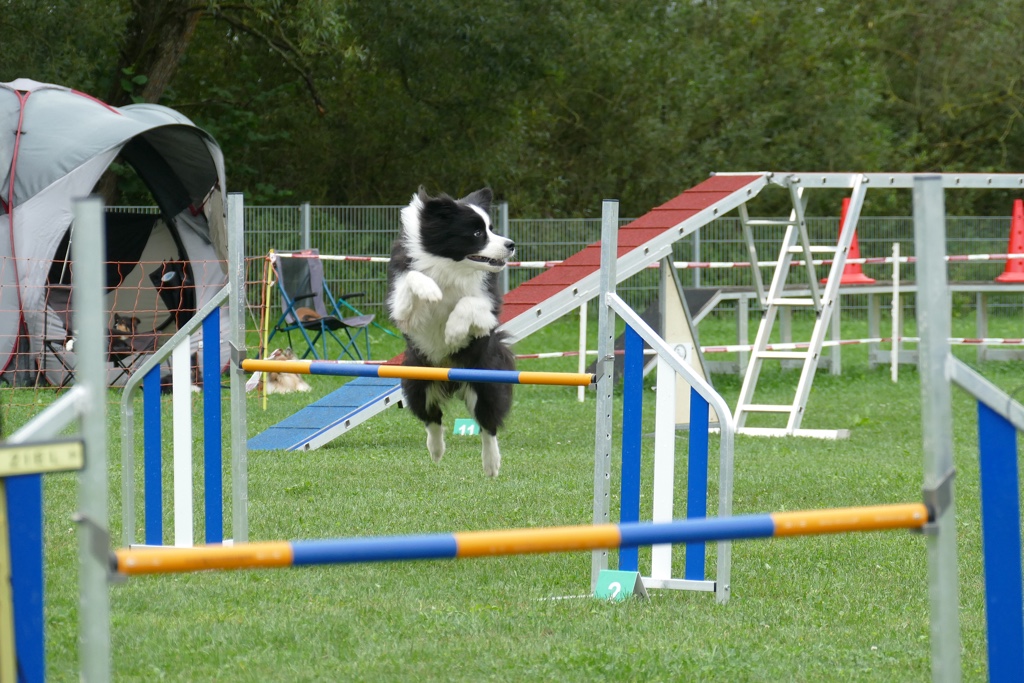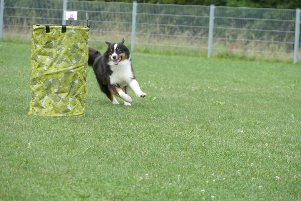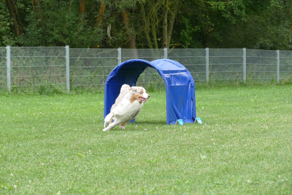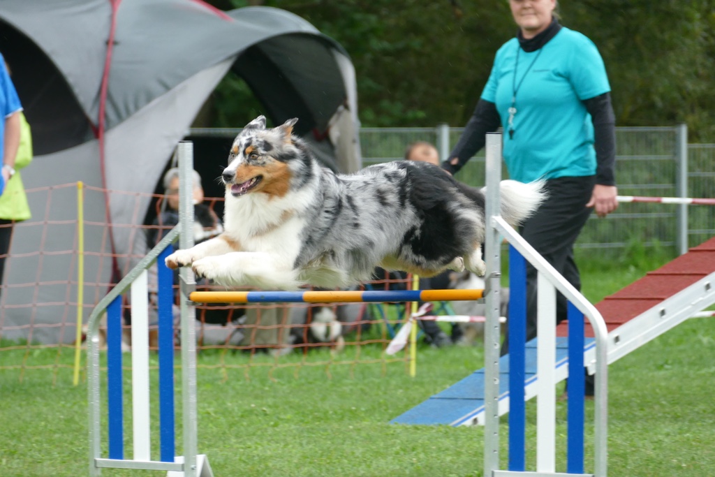 Frisch und klar präsentierte sich das Wetter. Von Regen noch keine Spur und auch wenn das Regenradar für den Nachmittag ordentlich nass versprach, schien die Sonne unbeeindruckt und wunderbar warm… etwas zu heiß vom Himmel. Heute stand Hoopers und Ausstellung auf dem Programm. Das Hoopers war eine offene Veranstaltung, also durften nicht nur Aussies starten und das Starterfeld präsentierte sich kunterbunt. Hoopers ist eine recht junge Sportart und wurde als gelenkschonendere Variante für das Agility entwickelt. Aber alleine durch die Wendungen und die Geschwindigkeit wirken doch hohe Fliehkräfte auf das ganze Hundeskelett und es ist eine sehr anspruchsvolle Sportart.
