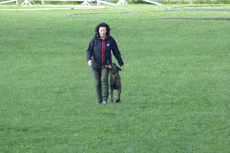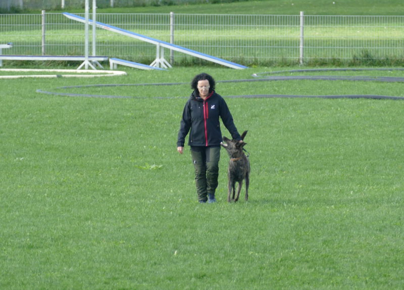 Beate hatte mit ihrem Lanero eine kleine Granate an der Leine. Lanero liebt es zu rennen und möchte doch ein bisschen mehr Action, als dieses Rumgelaufe. Aber entweder hatte Beate ihm versprochen, nachher ein ganzes Elefantenohr anzubraten oder er hatte beschlossen, nun ein totaler Musterhund zu sein, jedenfalls war er trotz aller innerlichen Hibbeligkeit wunderbar bei der Sache und bot auch dem kritischsten Blick nicht viel zum Mäkeln. Beate und Lanero haben nun die offizielle Erlaubnis im Turnierhundesport so richtig durchzustarten.