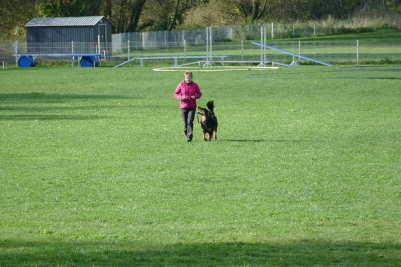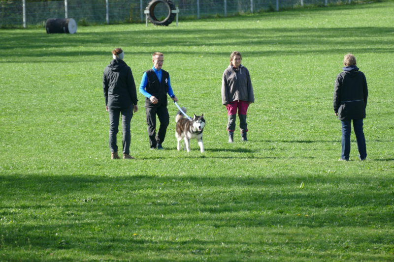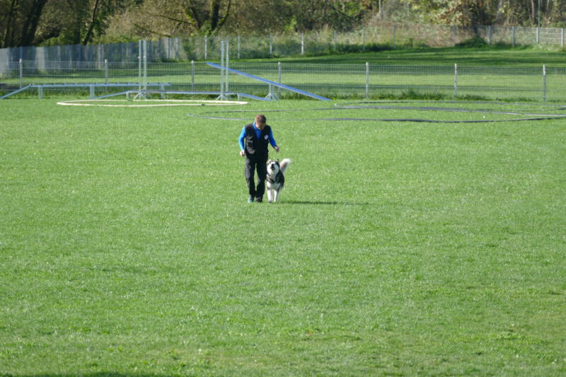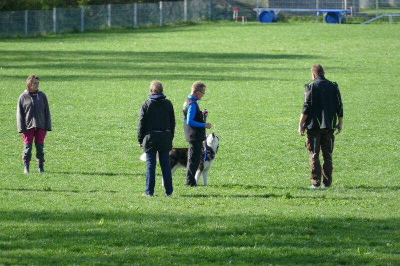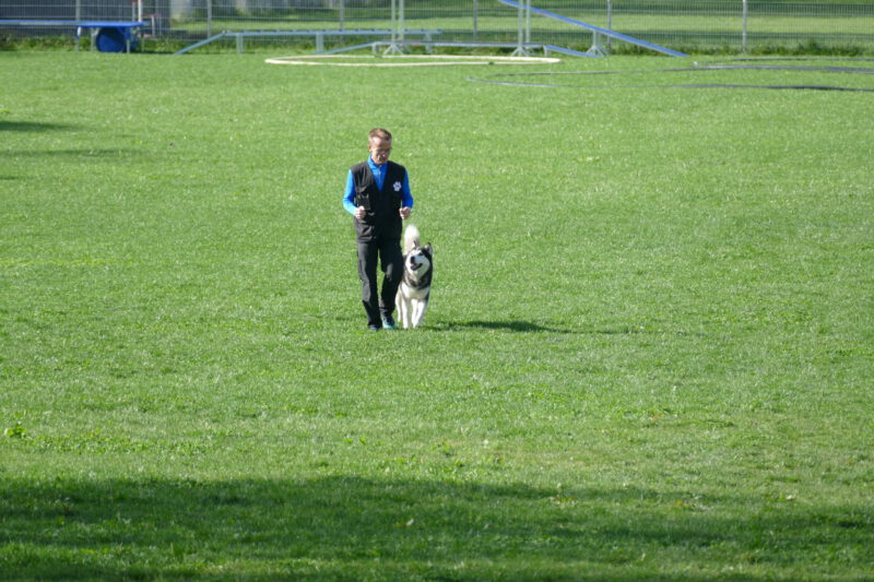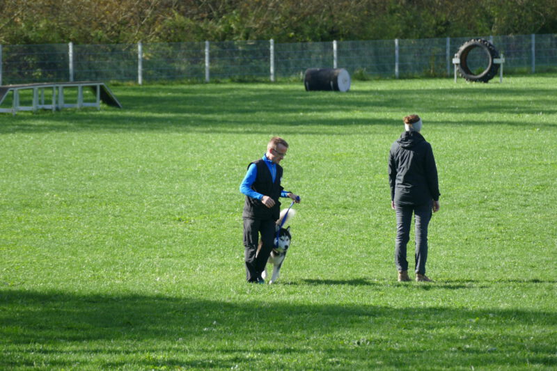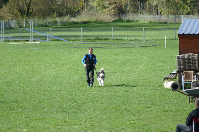 Dietmar und Hero starteten hochmotiviert und wirklich schön. Ein Husky ist eher unmotiviert für die Unterordnung. Schließlich ist sein Bewegungsdrang unglaublich hoch und so fand er die Prüfung zusehends blöder und zeigte dies seinem Herrchen auch durch einen Sitzstreik. Dietmar gab sich die allergrößte Mühe und versprach ihm vermutlich einen großartigen Lauf im Anschluss und mindestens noch einen Marathon hinterher, damit Hero sich entschloss, den Streik aufzulösen. Leider war trotz allem Good Will von Uschi nix mehr zu machen und sie musste den beiden leider mitteilen, dass dieser Teil der Prüfung nicht bestanden war.