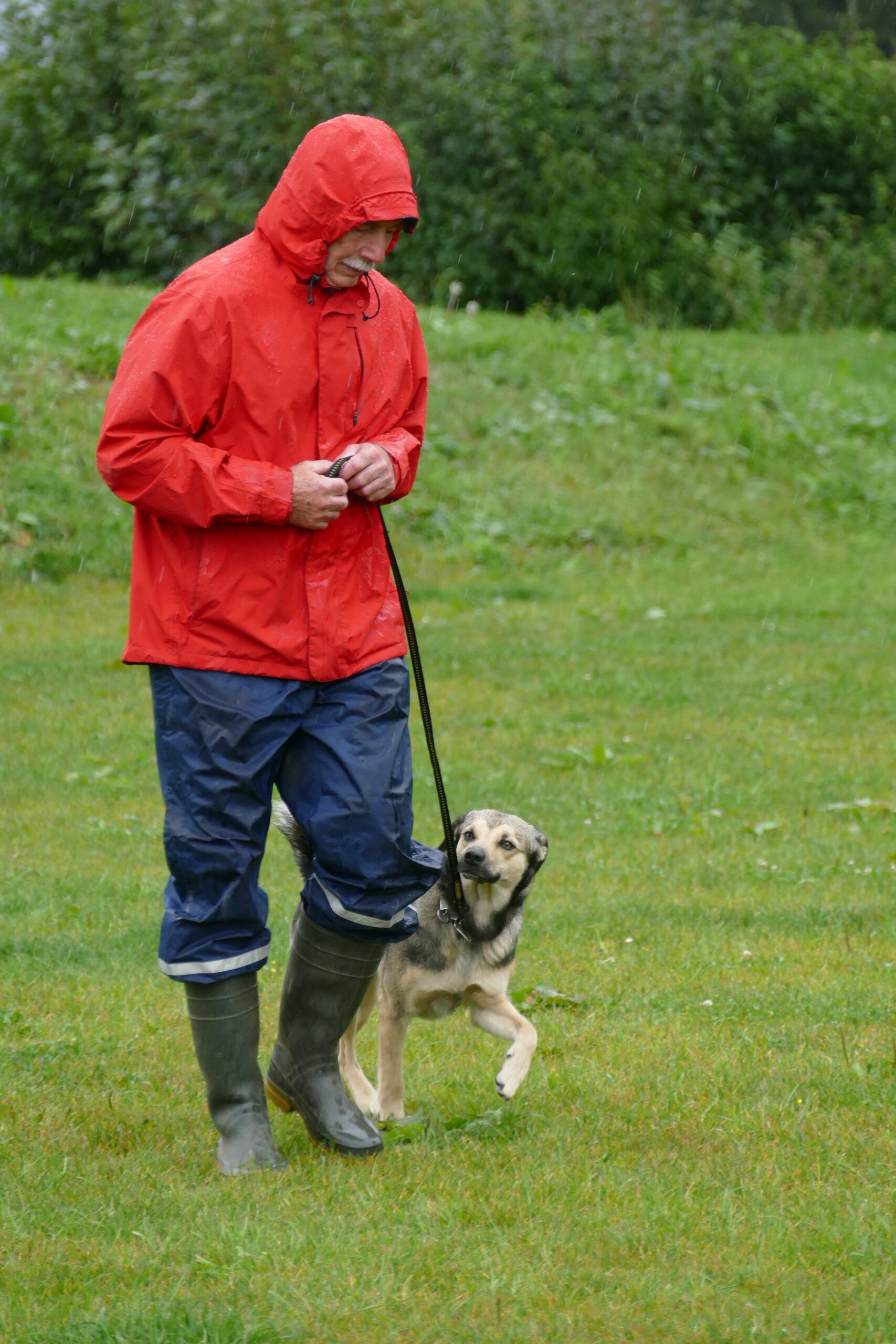 Nein, natürlich sind wir zwar auf dem matschigen Rasen gelaufen, aber schwimmen musste dann doch keiner. Es regnete sehr stark und so mancher Hund warf seinem Herrchen oder Frauchen einen frustrierten und ungläubigen Blick zu, aber alle machten das beste aus dem Wetter und ließen es eben über sich ergehen. Den Anfang machten Sandra mit Charly und Gaststarterin Anja mit der erst 16 Monate alten Cipsy.