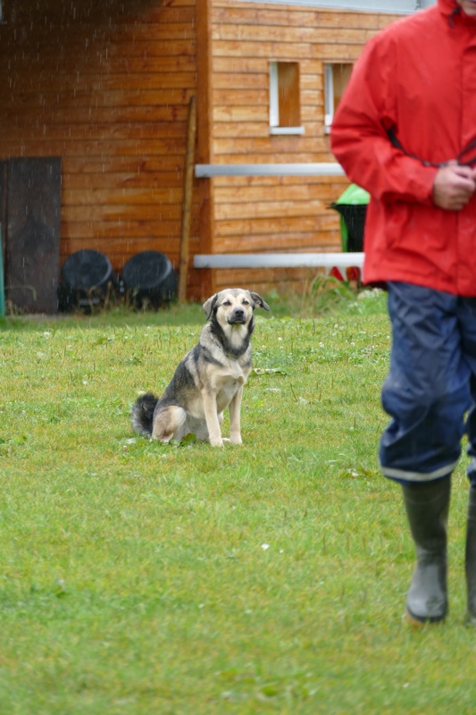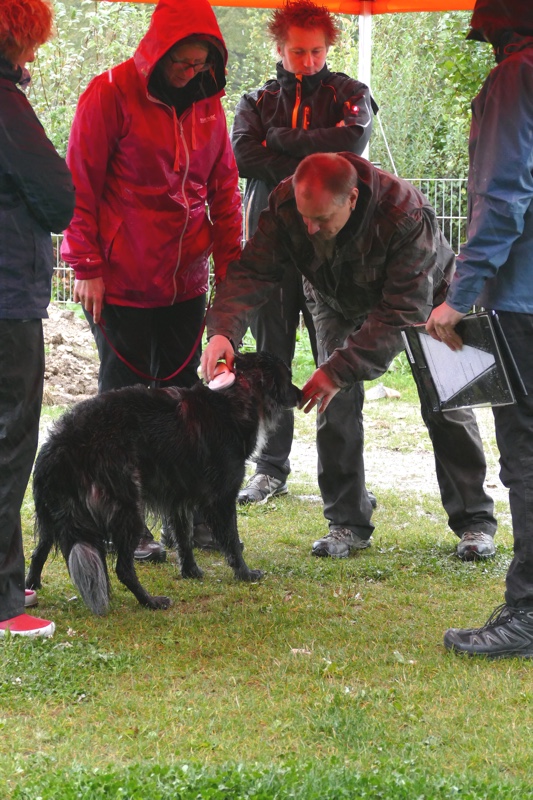Der Regen zeigte keine Gnade als Malte mit Aria und Sabrina mit Hurrikan an den Start gingen. Malte sollte seine kleine Aria zuerst ablegen, was ihn einige Mühe kostete, denn Aria sah es überhaupt nicht ein, sich in den Sumpf zu legen. Schließlich konnte er sie überzeugen (vermutlich hat er ihr eine gebratene Kuh und einen eigenen Kachelofen versprochen) und sie legte sich hin. Trotz Starkregen blieb sie auch eisern liegen, während Sabrina mit Hurrikan ihre Prüfung begann. Hurrikan versuchte zwar ab und zu mal ein bisschen unter den Regentropfen durchzutauchen oder auszuweichen, aber insgesamt lief er sehr schön mit und zeigte weder beim Sitz oder Platz aus der Bewegung Unsicherheiten, obwohl er sehr unglücklich aussah. Der Vorsitz war auch nahezu perfekt und die Erleichterung war ihm deutlich anzumerken, als er sich am Ende der Regentortur sah.