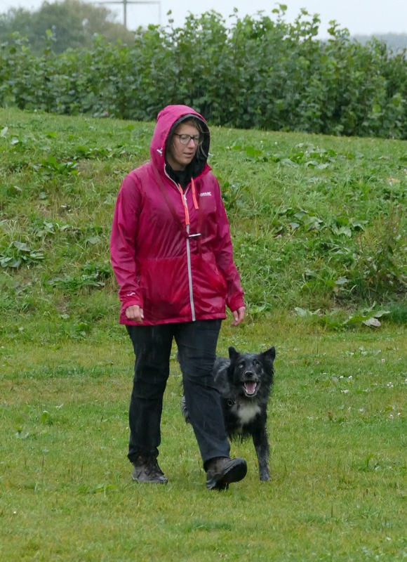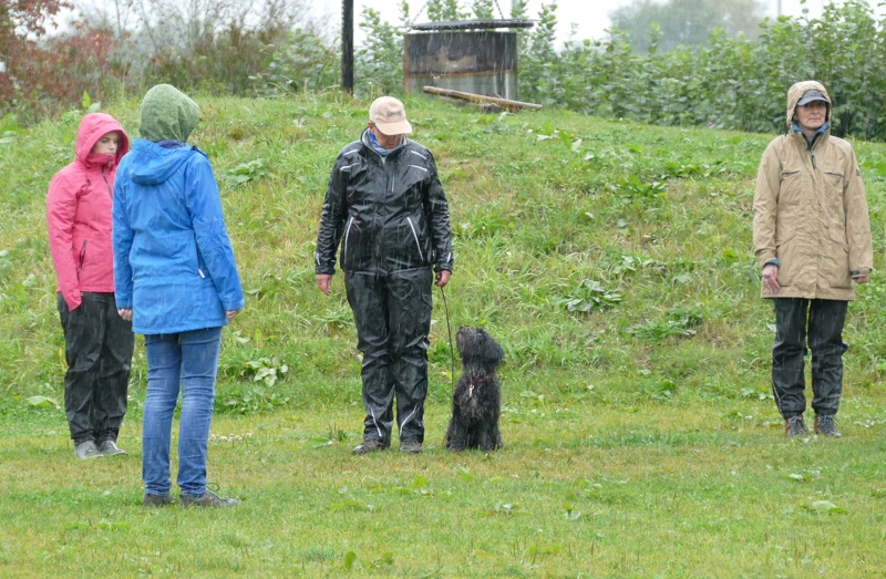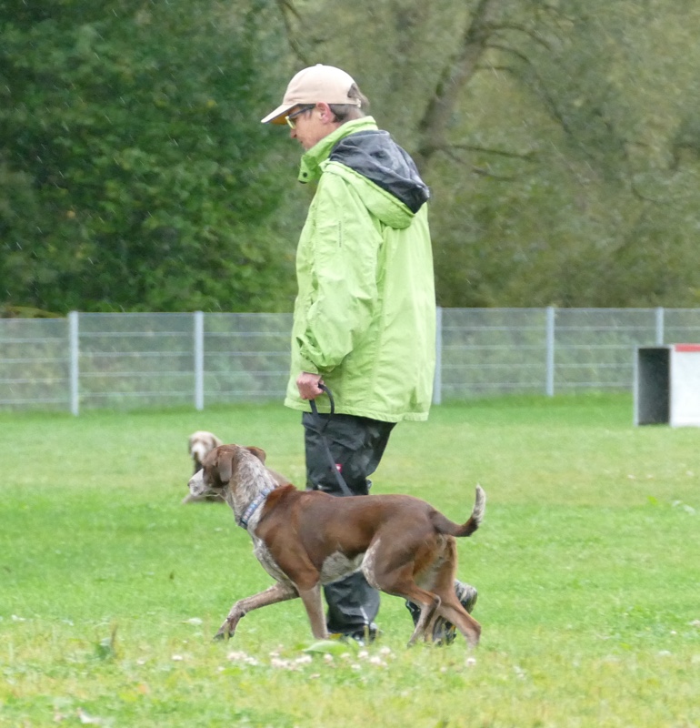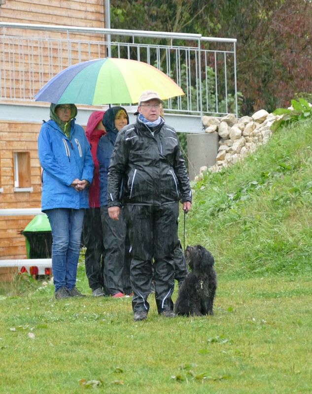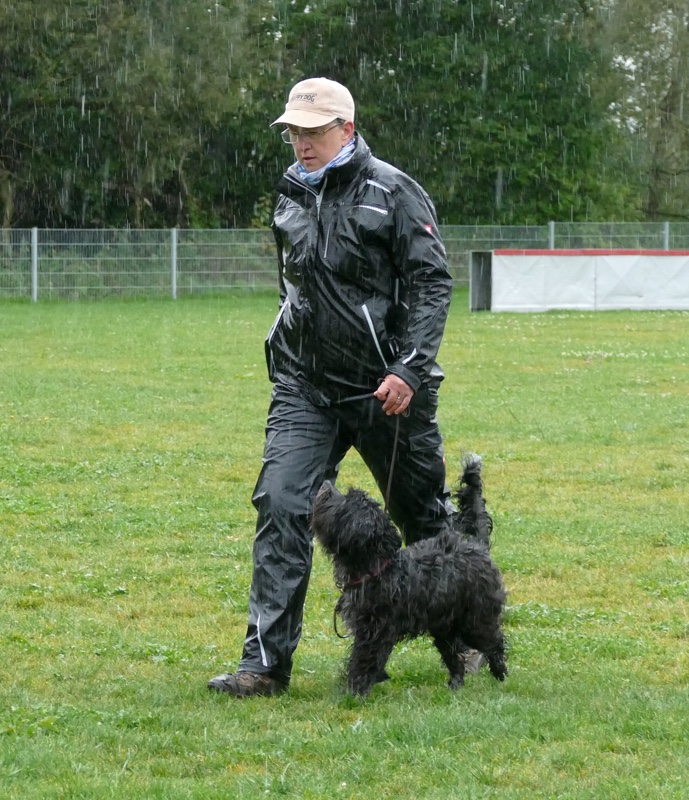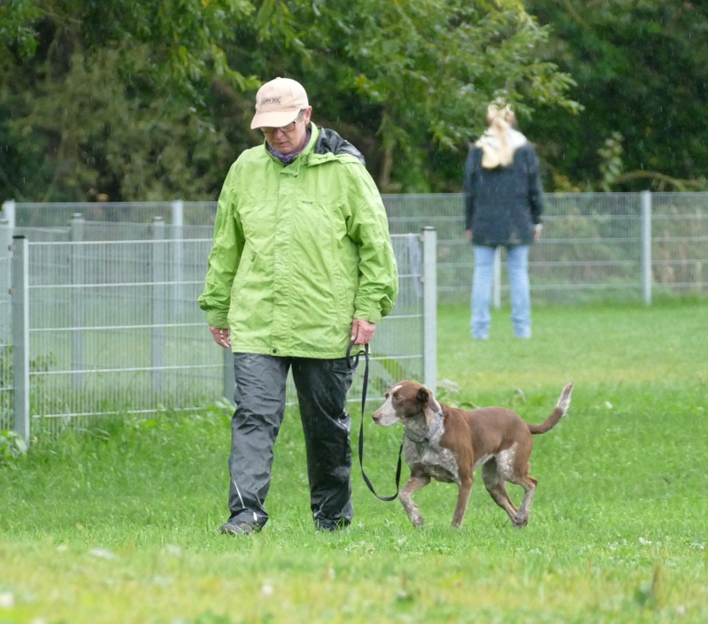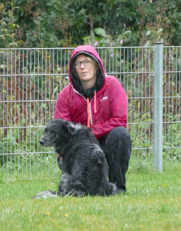 Anja legte ihre Cipsy unter deren todesverachtenden Blicken ab und stellte sich dann mit dem Rücken zum Geschehen hin, während Sandra mit Charly an den Start ging. Nachdem er ein paar Mal hilfesuchend zu ihr und zu der bereitstehenden Gruppe (unter einem Schirm) guckte, ergab sich Charly seinem Schicksal und begleitete sein Frauchen sehr brav entlang dem Schema. Bis auf Kleinigkeiten konnte auch der aufmerksame Leistungsrichter keine Fehler entdecken und mit einem deutlich erleichterten Gefühl konnte Sandra ihren Charly ablegen, während Anja mit Cipsy das Schema absolvierte. Cipsy saß teilweise da wie der sprichwörtlich begossene Pudel, als der Regen nochmal eine Schippe drauf legte und es wie aus Eimern kübelte.