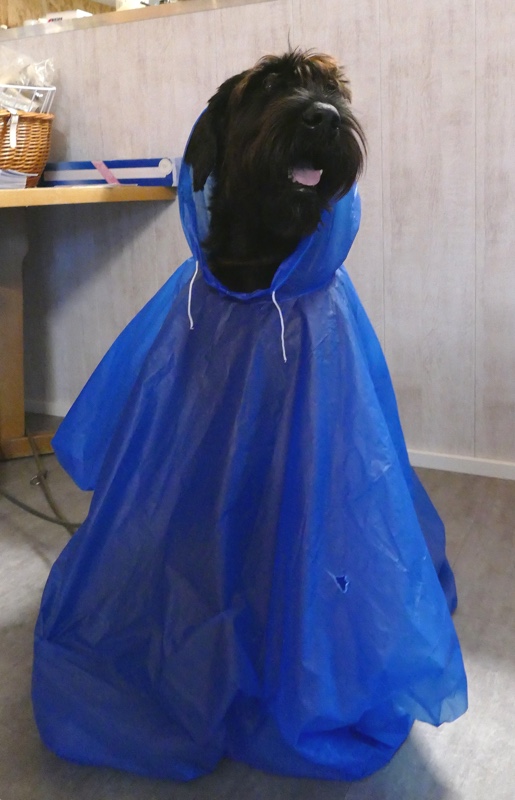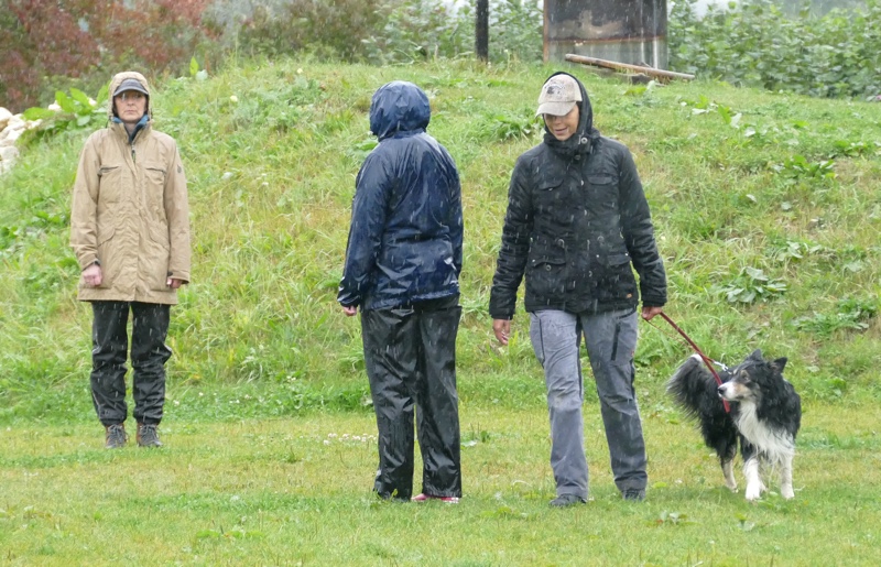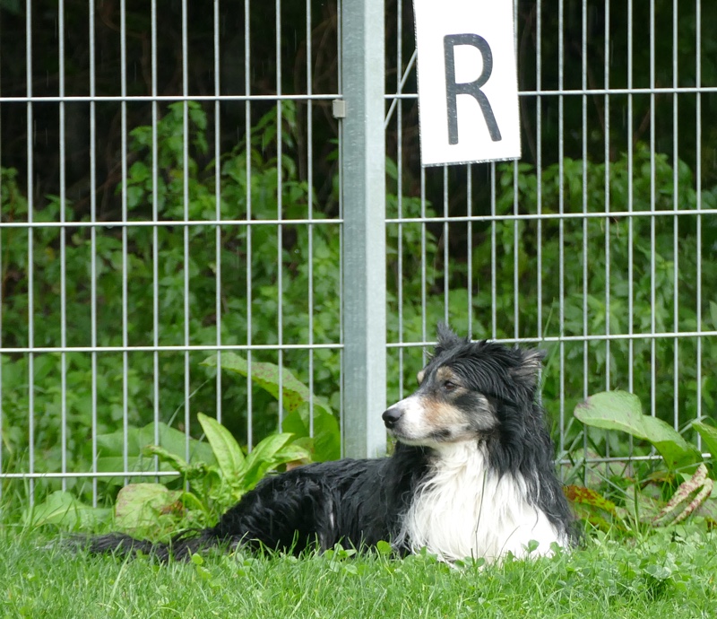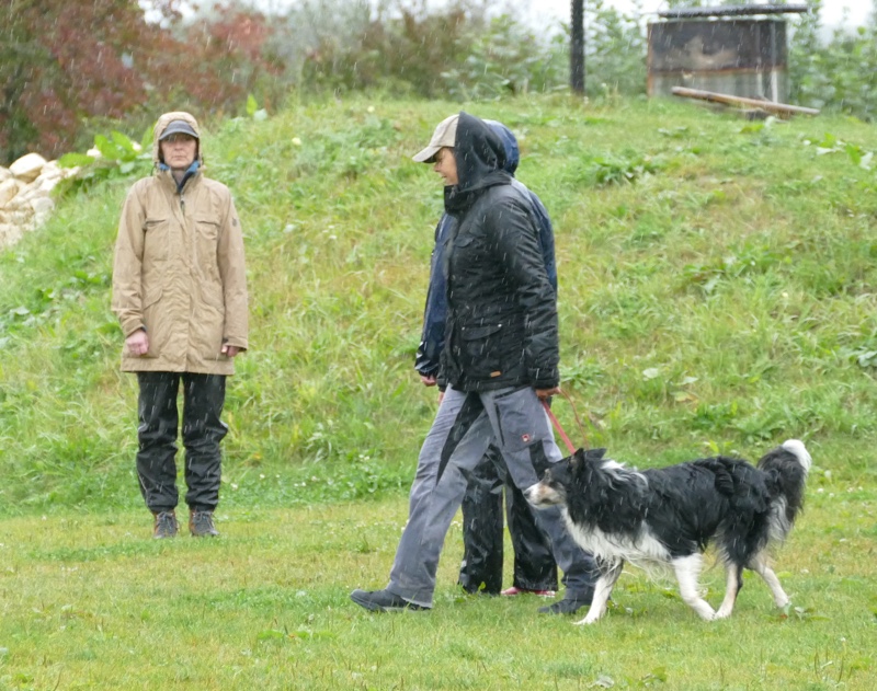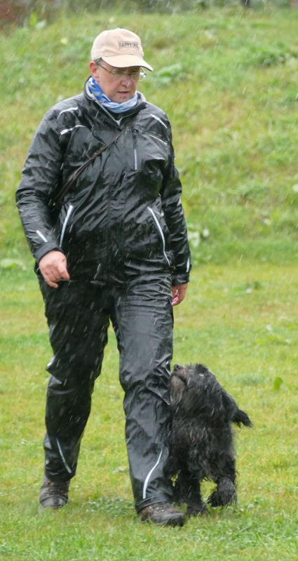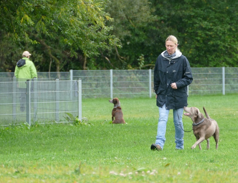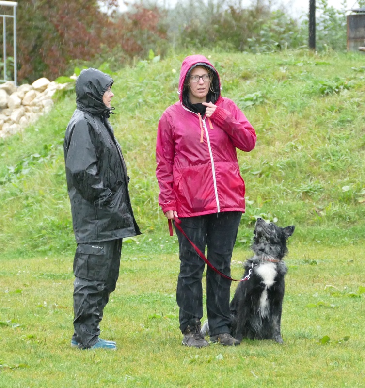 Anja legte ihre Cipsy unter deren todesverachtenden Blicken ab und stellte sich dann mit dem Rücken zum Geschehen hin, während Sandra mit Charly an den Start ging. Nachdem er ein paar Mal hilfesuchend zu ihr und zu der bereitstehenden Gruppe (unter einem Schirm) guckte, ergab sich Charly seinem Schicksal und begleitete sein Frauchen sehr brav entlang dem Schema. Bis auf Kleinigkeiten konnte auch der aufmerksame Leistungsrichter keine Fehler entdecken und mit einem deutlich erleichterten Gefühl konnte Sandra ihren Charly ablegen, während Anja mit Cipsy das Schema absolvierte. Cipsy saß teilweise da wie der sprichwörtlich begossene Pudel, als der Regen nochmal eine Schippe drauf legte und es wie aus Eimern kübelte.