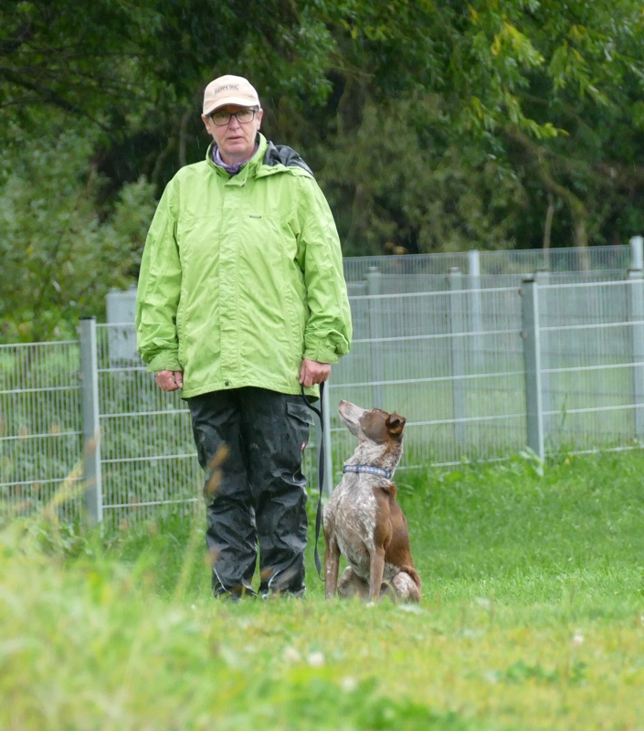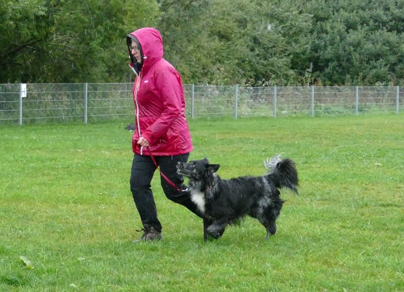 Etwas nervös ging sie an den Start, aber dann zeigte das kleine Mädchen aus Spanien – ich meine Jula – was sie gelernt hatte und lief sehr schön, aber etwas weit weg neben Susanne her. Der Regen hatte zum Glück etwas nachgelassen und spülte weder Hund noch Frauchen vom Platz. Die beiden schafften alle Elemente des Schemas sehr gut bzw. gut und so konnte Leistungsrichter Dieter Jäkel auch diesen beiden Teams den Teil 1 als bestanden verkünden. Jetzt wurde erstmal kurz gefeiert, bis es nachher zum 2. Teil ging.