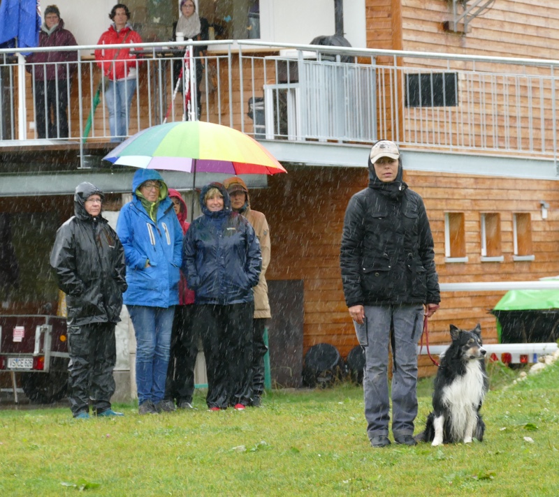 Aber insgesamt blieb sie sehr schön in der Position und ließ sich auch nicht davon ablenken, dass Hurrikan mittlerweile gelangweilt aufstand und sich schnüffelnder Weise auf Sabrina zubewegte. Mit kleinen Abzügen in der B-Note bestanden auch diese beiden Teams den ersten Teil und wurden von den – im trockenen stehenden – Zuschauern bejubelt und gefeiert.