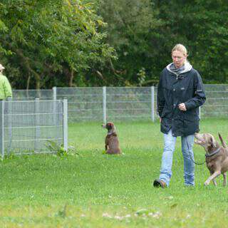 Nun gingen die letzten Teams an den Start. Gaststarterin Susanne sollte ihre Jula zuerst ablegen, während Nadine mit Pepper das Schema lief. Jula fand das Abliegen genauso doof, wie die Vorgänger, blieb aber auf der von Frauchen bestimmten Stelle. Nur beschloss das Hundemädchen resolut, dass es ausreichend ist, an der Position zu sitzen, anstatt sich ganz ins nasse Gras zu legen. Nadine und Pepper hatten kleine Schwierigkeiten und Pepper pendelte sehr hin und her, blieb aber doch bei ihrem Frauchen. In der Gruppe verweilte sie etwas länger bei dem einen oder anderen Menschen, um die Leckerliekontrolle durchzuführen, ließ sich aber von ihrem Frauchen immer wieder in die Position bringen.