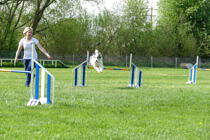 Punkt 9 – naja +/- ein Viertelstündchen später ging es schon los. Leistungsrichter Oliver Gustke hatte einen anspruchsvollen, aber gut machbaren Parcours gestellt, der mit der einen oder anderen Verleihung aufwartete. Trotzdem konnten einige Starter am Ende einen fehlerfreien Lauf aufweisen und an ihrem Aufstieg arbeiten. Seit diesem Jahr gibt es vier Sprunghöhen. Small mit 30 cm, Medium mit 40 cm, Intermediate (neu!) mit 50 cm und Large mit 60 cm Sprunghöhe. In der neuen Intermediate-Höhe gibt es noch nicht so viele Starter, da die Hunde alle neu eingemessen werden müssen, das wird sich aber sicher schnell ändern. Besonders niedlich war eine kleine Intermediate-Starterin in der Klasse 0, die mit der Hündin ihrer Mutter außer Konkurrenz lief und eindrucksvoll zeigte, dass auch ein 3jähriges Kind wunderbar führen kann.