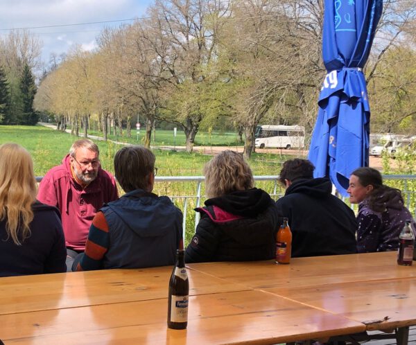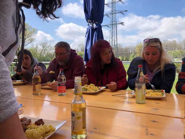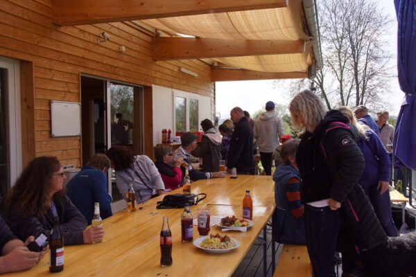 Unsere Wandergruppe traf gegen 12:30 Uhr gut gelaunt und hungrig ein und schon ging es an den Grill bzw. das was darauf schon so lecker brutzelte. In sehr fröhlicher Runde wurden die Salate und die Würstchen und natürlich das Fleisch verputzt und so mancher vierbeiniger Mitesser kam in den Genuss, der gemütlichen Atmosphäre.