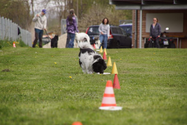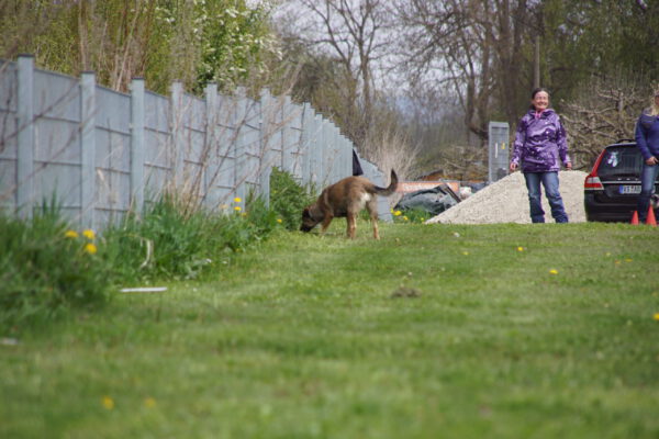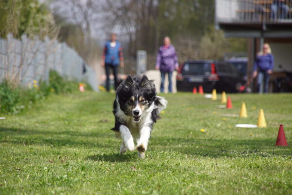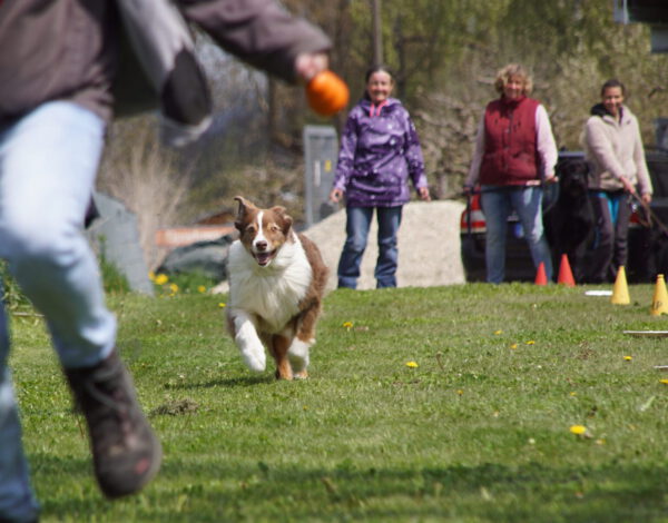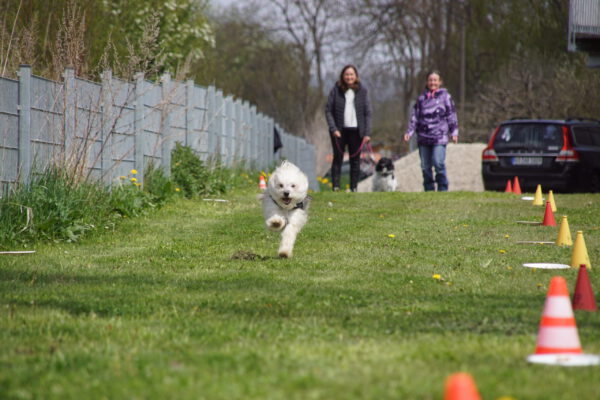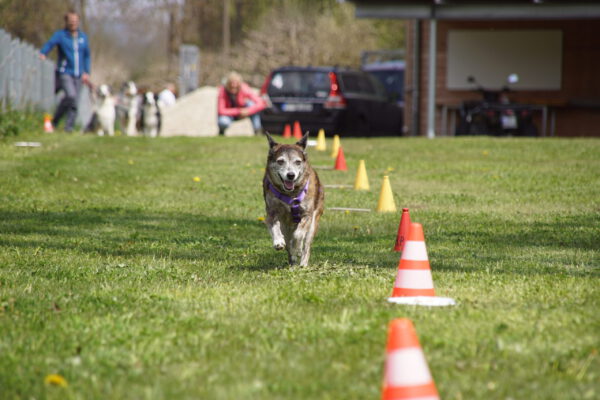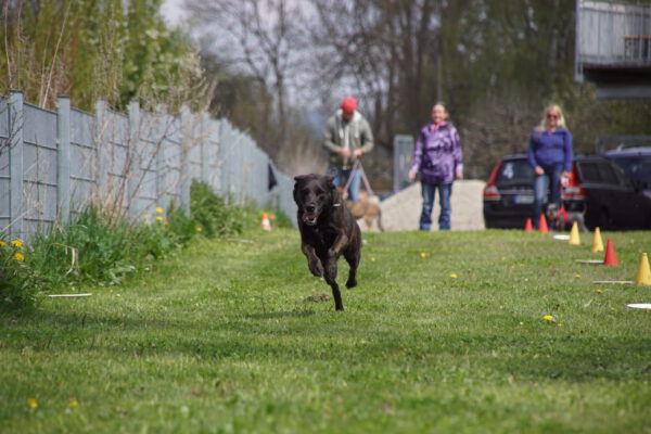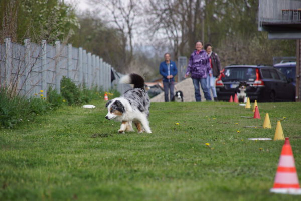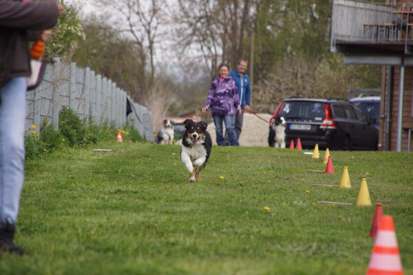 Nach dem Essen ist vor dem Sport. Nun ging es um die Wurst. Wortwörtlich, denn die Wienerle waren von Heike verteilt, die teilnehmenden Hunde sammelten sich im Starterfeld und unsere Stopper positionierten sich im Zielbereich. Nun mussten die Hunde nur noch vom Start auf direktem Weg möglichst schnell in Richtung Ziel bewegen, natürlich ohne den Umweg über die ausgelegten Wienerle zu nehmen.