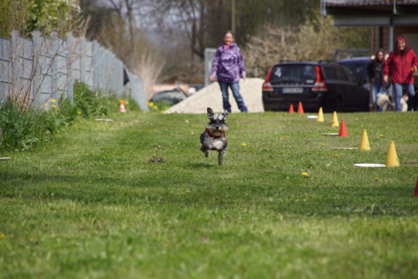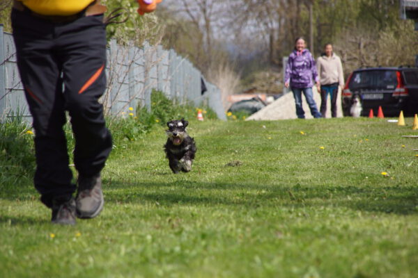 Mit 11 Jahren als älteste Teilnehmerin ging Espe souverän an den Start und ignorierte gekonnt die Verlockungen. Viel mehr Schwierigkeiten hatte dagegen Trainingskameradin Elena, die gerne der Versuchung folgte und sich ein, zwei Bissen schnappte. Die Riesenschnauzer von Andrea sind blitzschnell und können vorne ein gewichtiges Wort mitreden, wenn sie nicht grade mit der Nase in der Futterschüssel hängen. Auch die kleine Lotti von Malte konnte dem Lockruf der Sirenen… äh… Würstchen nicht widerstehen und war an der Snackbar hängen geblieben.