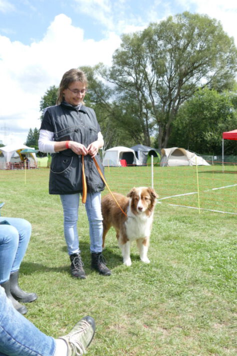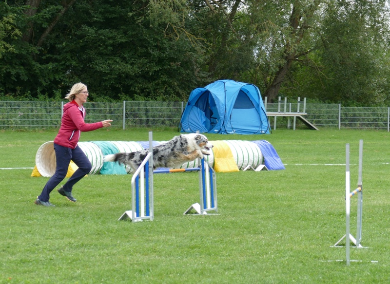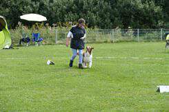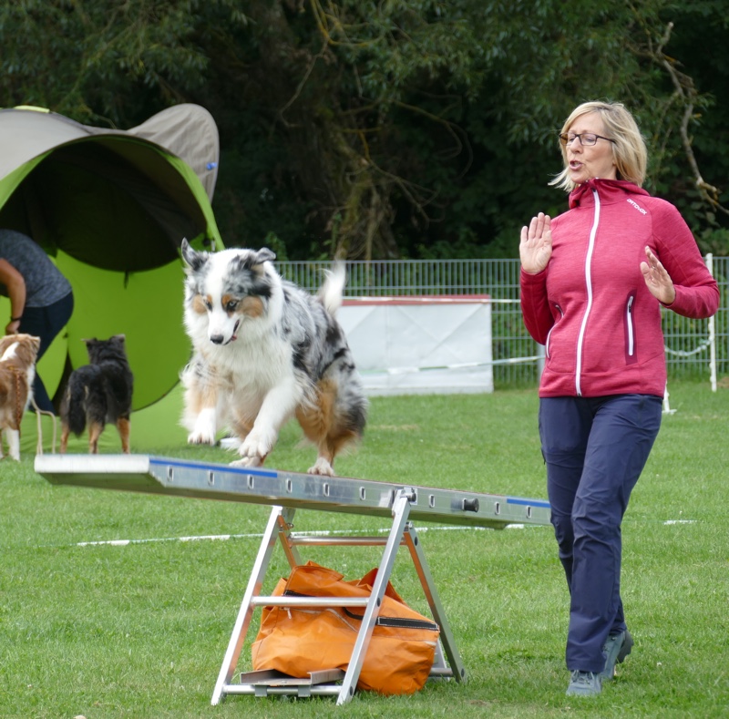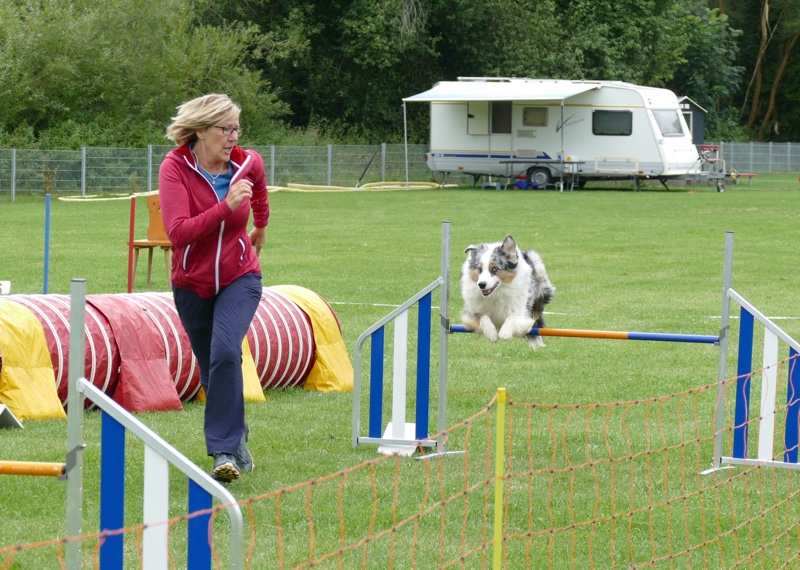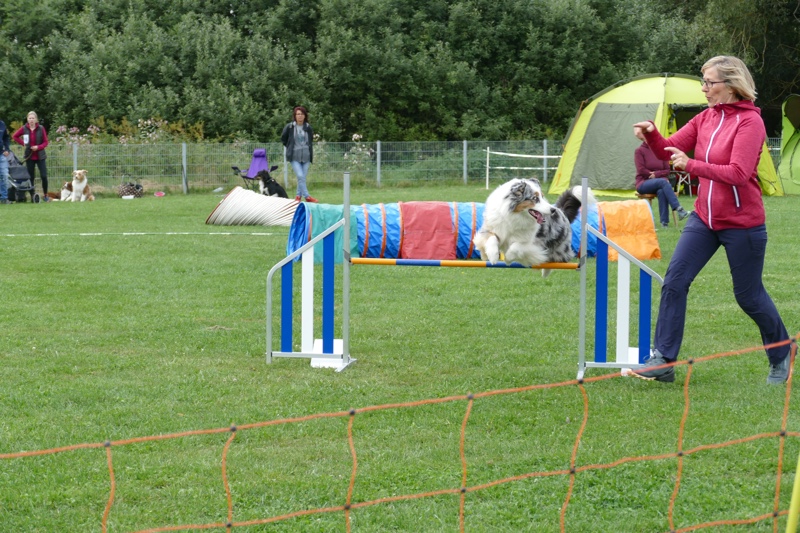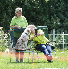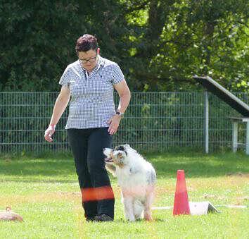 Als für die Klasse 1 umgebaut wurde, stieg die Anspannung noch einmal an. Petra und Nicole bereiteten sich auf ihre Starts vor. Beide hatten ihre „Angstsituationen“ direkt am Start und waren dementsprechend nervös. Während Yumi gewohnt unbekümmert und quirlig war, wäre Petra bei einem Antippen auf die Schulter vermutlich bis zum Mars in die Luft gegangen. Aber dann liefen sie sehr souverän los und kreiselten die 360° Drehung links wunderbar. Im Slalom mit Ablenkung verlegte sich Yumi aufs Schnüffeln nach Leckerchen und Petra hatte ihre liebe Not, ihr starrsinniges Aussiemädchen zu motivieren, den Verlockungen zu widerstehen. Leider berührte sie dabei Yumi, was die Disqualifikation zur Folge hatte. Schade für die Beiden, denn nach dem holprigen Start zeigten sie eine schöne Vorführung und sie wären mit 84 Punkten belohnt worden.