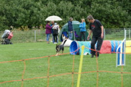 Gleich früh morgens machte sich Nervosität bei den Donaueschinger Startern breit. Eigentlich hätten Nicole und Petra alleine für den Strom in ganz Südbaden sorgen können, so sehr unter Spannung standen die zwei. Doch zuerst mal zum allgemeinen Turnier. Richterin Iris Pürkel hatte sehr kreative Parcours erstellt und forderte viel, aber nicht unmögliches von den Startern. Mit ihrer sympathischen Art forderte sie auf: „Hier liegen 100 Punkte, du musst sie nur noch aufheben!“. Begonnen wurde mit der höchsten Klasse 3 und dort durften die Teilnehmer gleich mal zeigen, wie sie und ihr Hund als Team waren. In der Klasse 2 startete Claudia Bosselmann als Organisatorin und bis zu einem kleinen, aber sehr punkteträchtigen Patzer lief es für sie und Magic sehr gut.