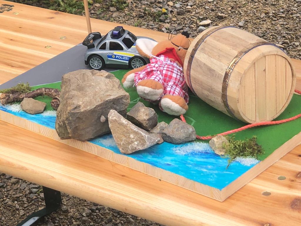 Uns so trafen sich am ersten Mai morgens 36 erwartungsfrohe Mitglieder mit ihren Fellnasen am Parkplatz bei der Römischen Badruine in Hüfingen. Nach einer kurzen Begrüßung folgte eine Einführung für die frischgebackenen Ermittler in ihren aktuellen Fall. Auch der Fundort des Opfers wurde anhand eines kleines Dioramas in Augenschein genommen.