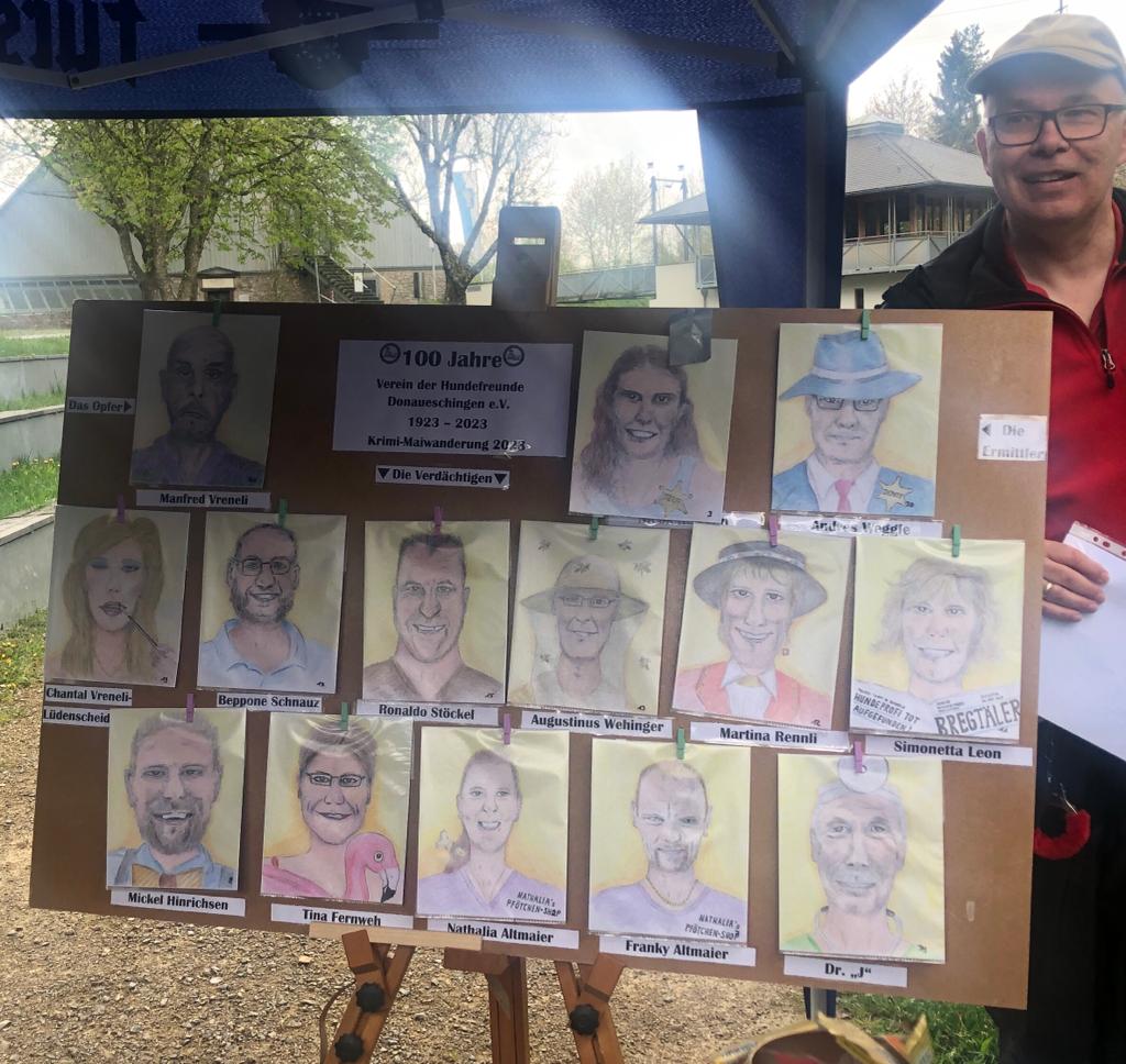 Natürlich durfte wie bei jedem guten Krimi die Wand mit den Verdächtigten nicht fehlen. Als die selbstgemalten Verdächtigenportraits präsentiert wurden, erntete man bereits die ersten Lacher. Denn obwohl explizit darauf hingewiesen wurde, dass jegliche Ähnlichkeit mit bekannten Personen nicht beabsichtigt sei, konnte man mit etwas Phantasie durchaus das ein oder andere Vereinsmitglied mit einem Pseudonym versehen wiedererkennen.