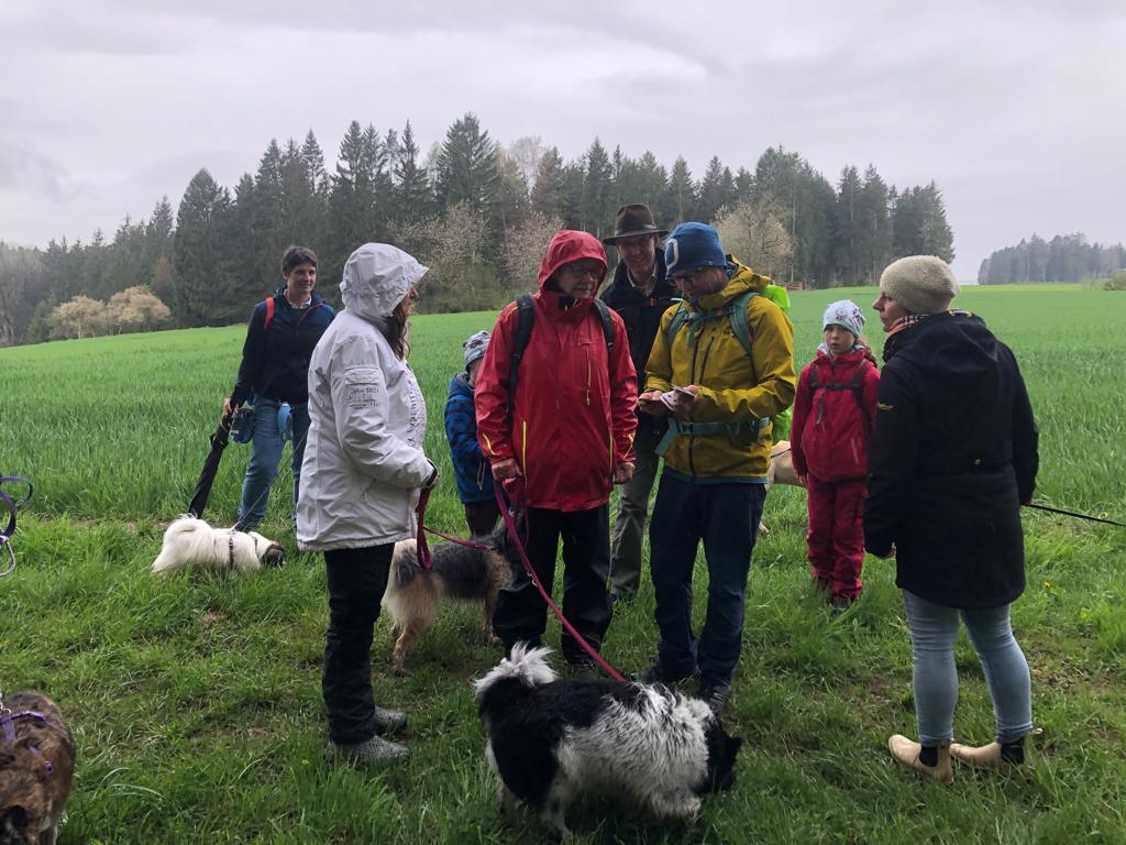 So wurden die Wanderer in drei Teams aufgeteilt und mit etwas Arbeitsmaterial ausgestattet. Etwas zeitversetzt ging es auf den 4 km langen Spaziergang. Natürlich war die Tour zuvor mit einigen Stationen präpariert worden, an denen die Teams jetzt etliche Hinweise, Aussagen und Alibis ausfindig machen konnten. Dabei trotzen sie auch tapfer den mittlerweile einsetzenden Regenschauern.