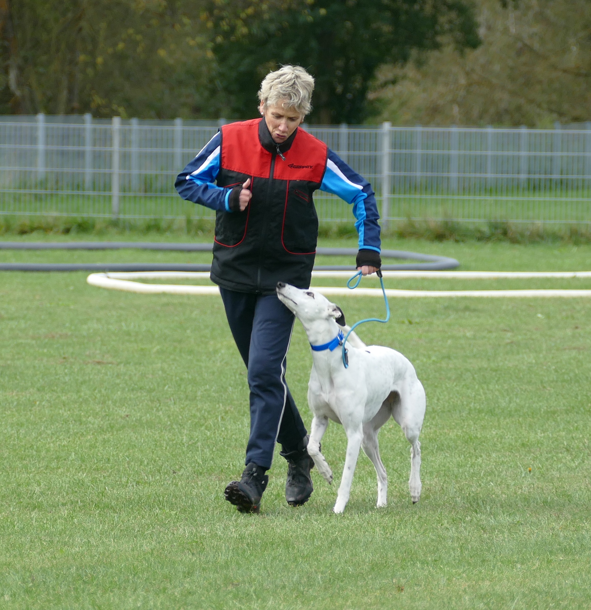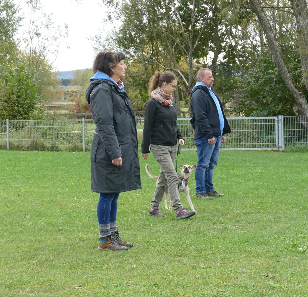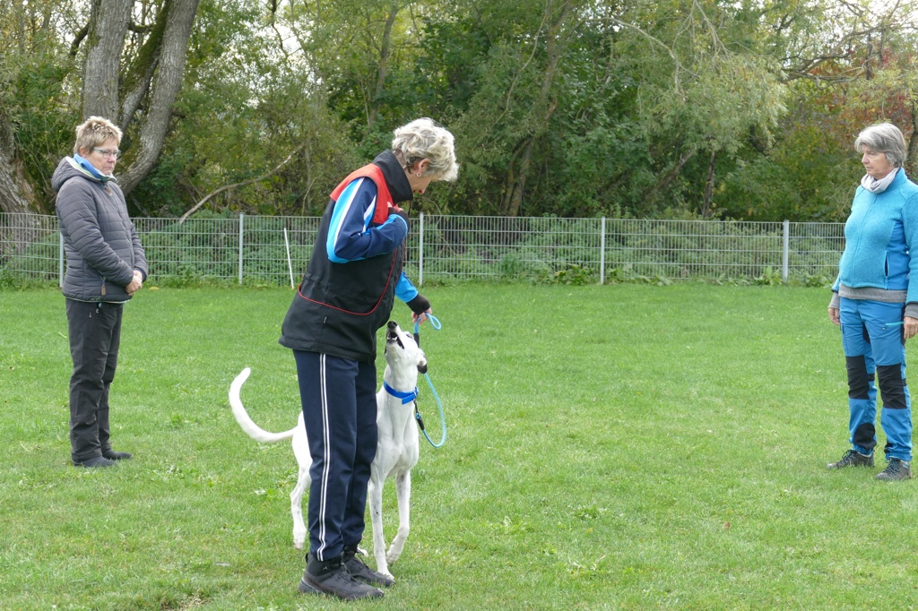 Nun folgte die diesjährige mehrfache Landesmeisterin im Mantrailing Martina mit ihrer Chrystal. Die beiden starteten sehr beschwingt und sportlich. Chrystal war irre begeistert und aufmerksam. Das war ja alles so toll für sie. In der Gruppe gab es eine kurze Taschenkontrolle bei Natalie, aber dann war Chrystal wieder voll bei der Sache. In der Freifolge lief es sogar noch besser und Chrystal streberte ganz schön rum. Sitz und Platz aus der Bewegung waren auch super und der Abruf windhundlike sehr flott, aber Chrystal bretterte direkt in die etwas schiefe Grundstellung, so viel Tempo hatte sie drauf. Die freie Ablage war wieder kein Problem. Da kann das Windhundmädchen eine Runde schlafen.