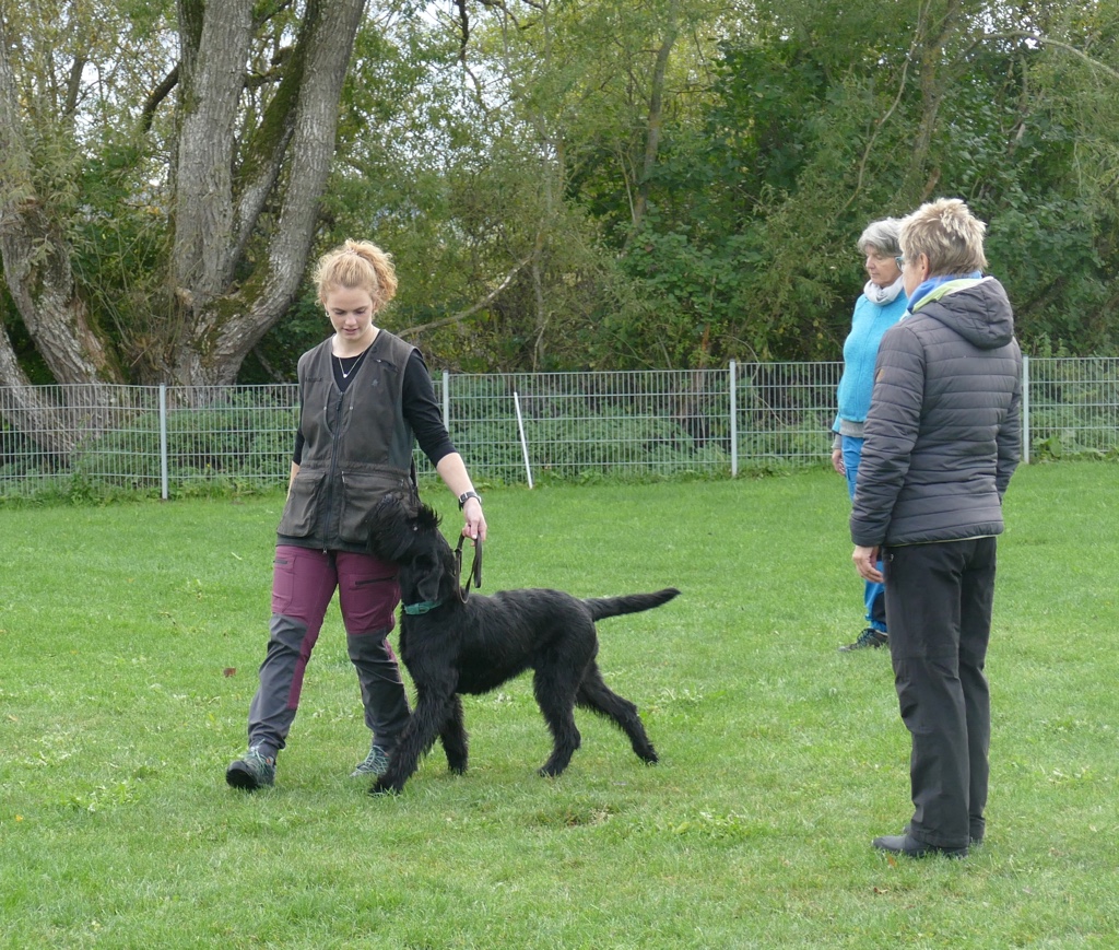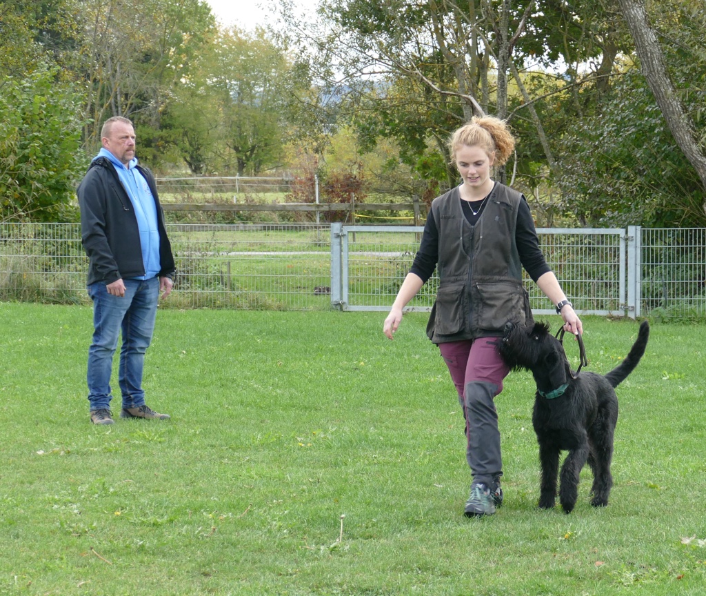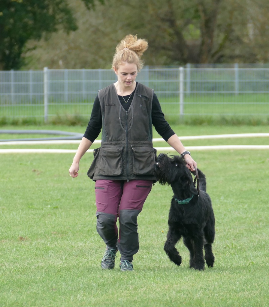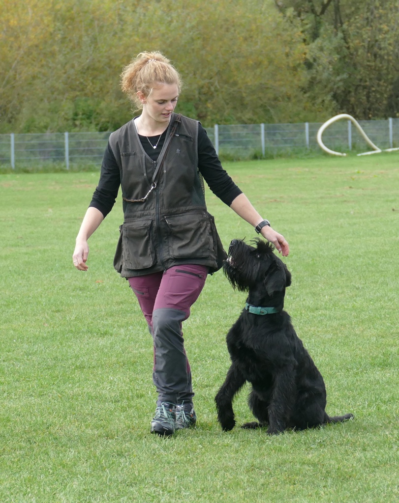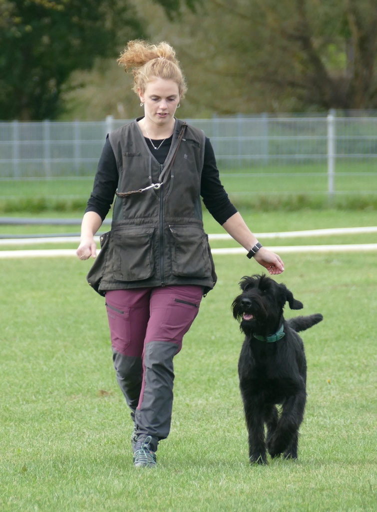 Als vorletzte Starterin stellte sich Nicola mit ihrem Schnauzermädel Odina den wachsamen Augen von Richterin Tanja. Nicola hat Odina als etwa 1jährige Hündin übernommen, nachdem ihre erste Familie mit dem Temperament der Hündin nicht klar kam. Die beiden sind zu einem tollen Team herangewachsen und verstehen sich fast blind. Odina zeigte, was in ihr steckte und absolvierte eine perfekte Prüfung. Alles klappte wie am Schnürchen und die ganze Nervosität fiel mit einem Schlag von Nicola ab, als Dina sich nicht ablenken ließ und einfach nur an ihrer Seite blieb. Die beiden zeigten auch eine perfekte Ablage und konnten dem nun kommenden Verkehrsteil gelassen entgegen sehen.