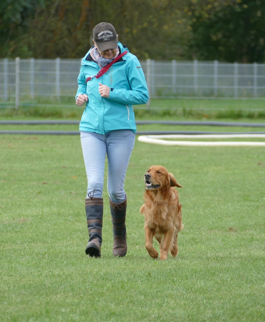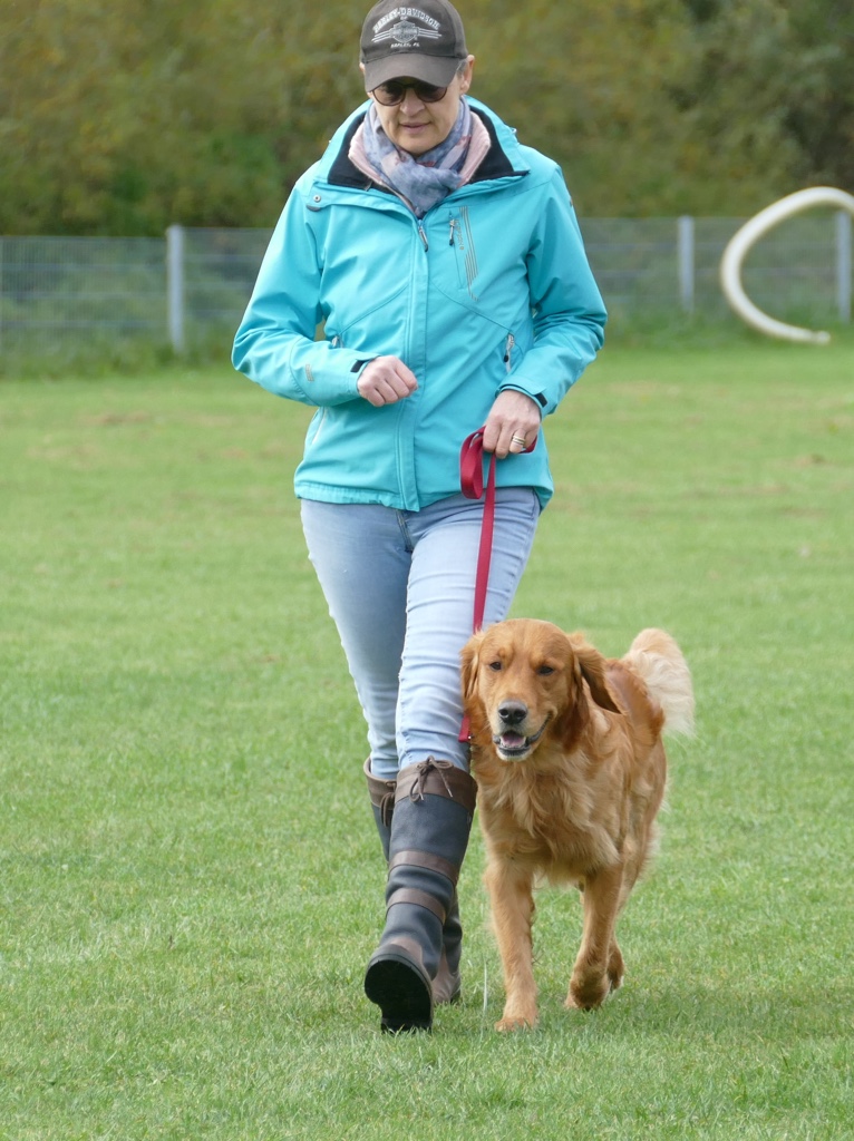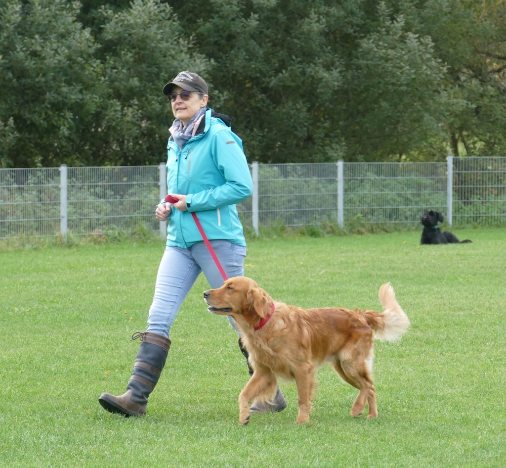 Claudia und ihr Golden Retriever Keks waren der Gegenpart. Die beiden hatten ihre freie Ablage schon hinter sich und nun ging es ans Schema. Keks ist ein richtiger Knuddelbär und fand das alles sehr amüsant. Er schlenderte gemütlich mit seinem sehr aktiven Frauchen mit und ließ sich mit ein bisschen Überredungskunst dazu bewegen alles brav mitzumachen. Hier mal ein bisschen Schnüffeln, dort mal ein interessierter Blick zu der Gruppe „Hat da keiner einen Keks für den armen Keks?“, aber er war immer beim Frauchen und führte die Kommandos in seiner Geschwindigkeit sehr brav aus. Auch für diese beiden hieß es: „Teil 1 bestanden“.