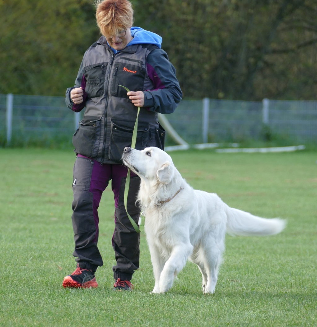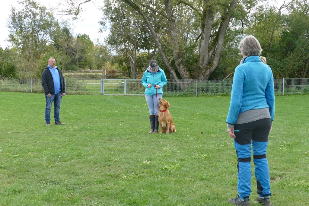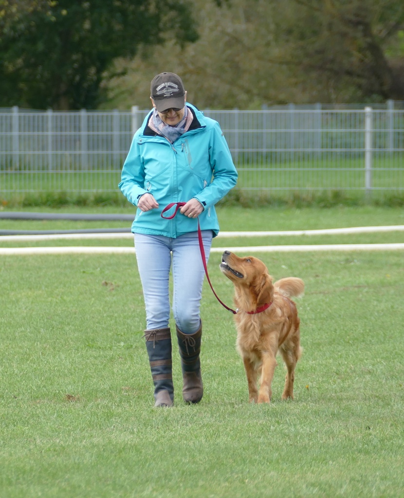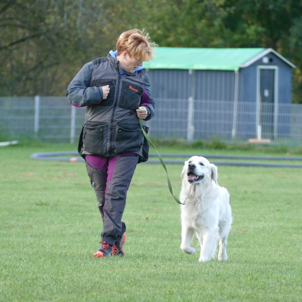 Claudia und ihr Golden Retriever Keks waren der Gegenpart. Die beiden hatten ihre freie Ablage schon hinter sich und nun ging es ans Schema. Keks ist ein richtiger Knuddelbär und fand das alles sehr amüsant. Er schlenderte gemütlich mit seinem sehr aktiven Frauchen mit und ließ sich mit ein bisschen Überredungskunst dazu bewegen alles brav mitzumachen. Hier mal ein bisschen Schnüffeln, dort mal ein interessierter Blick zu der Gruppe „Hat da keiner einen Keks für den armen Keks?“, aber er war immer beim Frauchen und führte die Kommandos in seiner Geschwindigkeit sehr brav aus. Auch für diese beiden hieß es: „Teil 1 bestanden“.