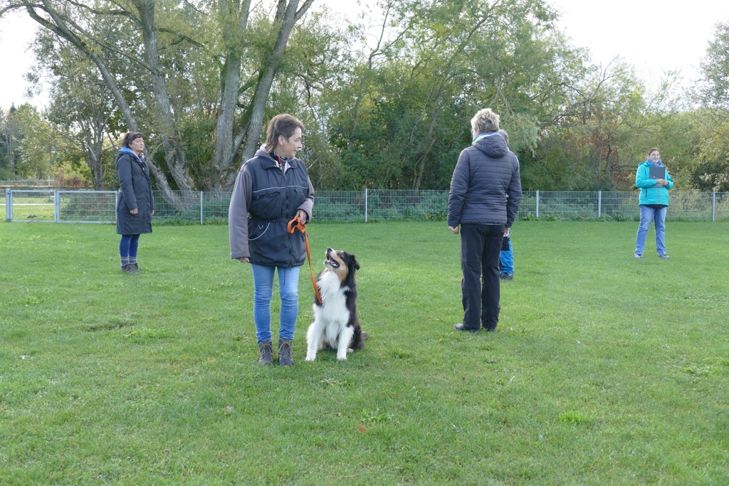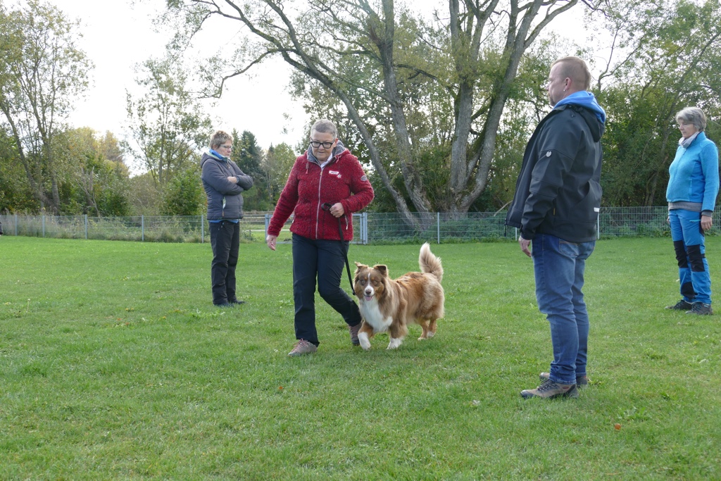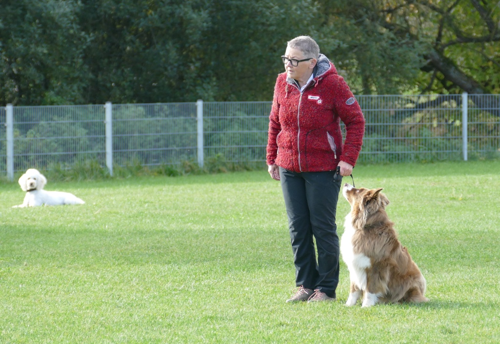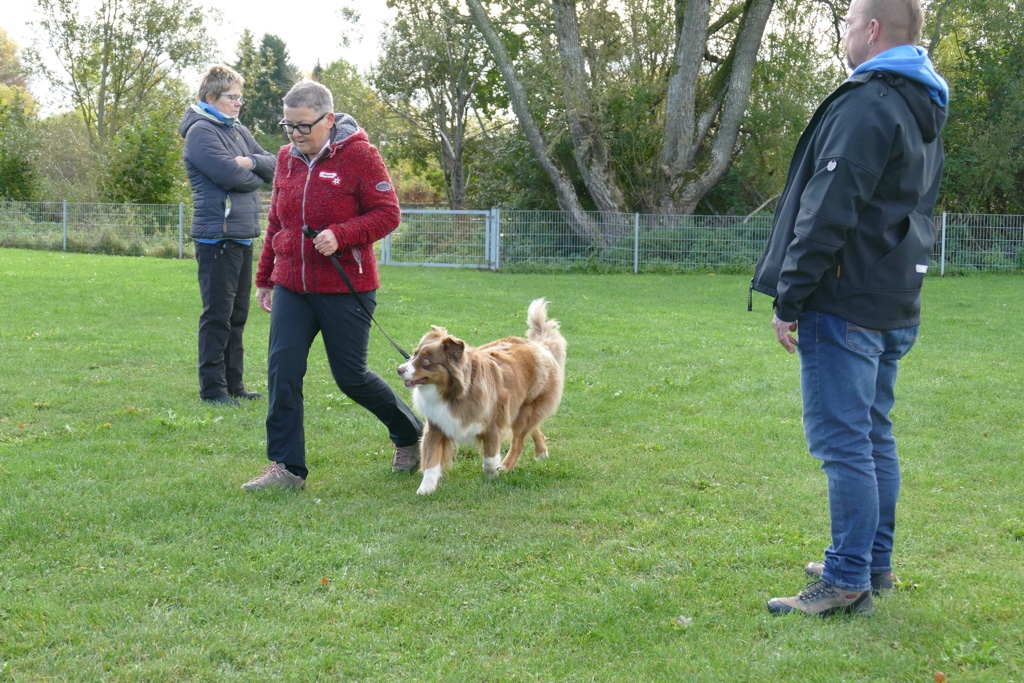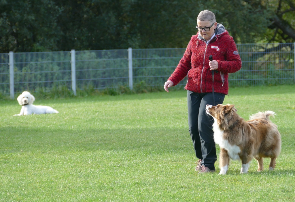 Die nächsten Teams meldeten sich und schon ging es für Claudia und ihre Australian Shepherd Hündin Grace los. Claudia ist schon einige Prüfungen gelaufen, aber die Aufregung ist immer ihr treuer Begleiter. Grace wollte ihr angespanntes Frauchen ein bisschen auflockern und hopste neben ihr rum. Sobald die beiden sich eingegrooved hatten lief es aber wie am Schnürchen und bis auf eine kleine Schnüffelung an der Gruppe ließ sich Grace nicht mehr ablenken. Bei der freien Ablage wurde es ihr so langweilig, dass sie irgendwann begann zu schnüffeln, dann aufstand und spazieren ging. Claudia und Grace konnten nicht voll überzeugen, aber Richterin Tanja sah Potential und gab ihnen die Chance sich im Verkehrsteil zu beweisen.