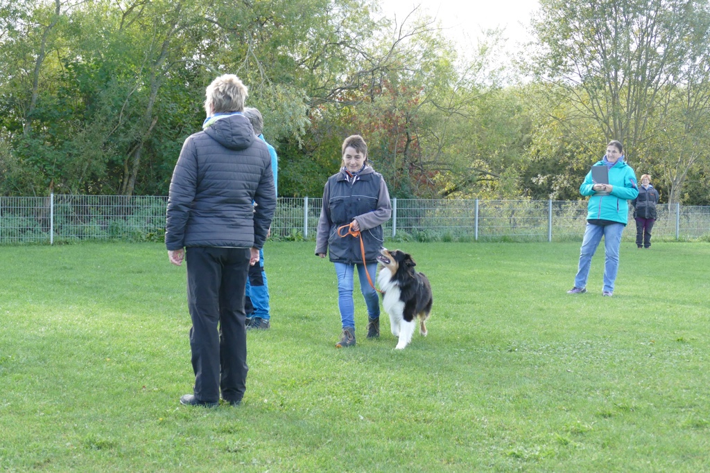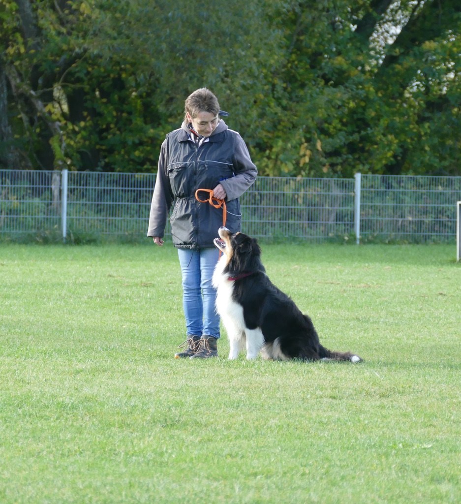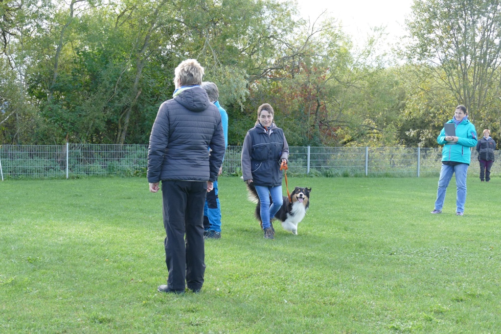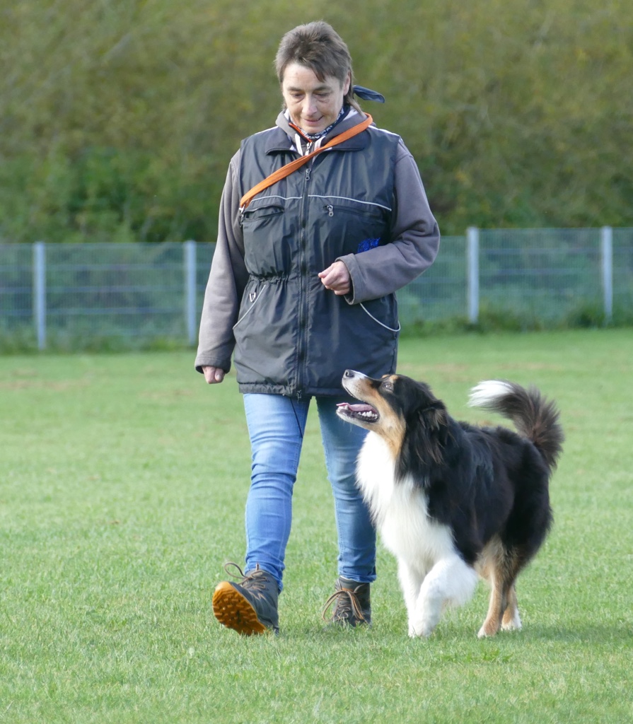 Die nächsten Teams meldeten sich und schon ging es für Claudia und ihre Australian Shepherd Hündin Grace los. Claudia ist schon einige Prüfungen gelaufen, aber die Aufregung ist immer ihr treuer Begleiter. Grace wollte ihr angespanntes Frauchen ein bisschen auflockern und hopste neben ihr rum. Sobald die beiden sich eingegrooved hatten lief es aber wie am Schnürchen und bis auf eine kleine Schnüffelung an der Gruppe ließ sich Grace nicht mehr ablenken. Bei der freien Ablage wurde es ihr so langweilig, dass sie irgendwann begann zu schnüffeln, dann aufstand und spazieren ging. Claudia und Grace konnten nicht voll überzeugen, aber Richterin Tanja sah Potential und gab ihnen die Chance sich im Verkehrsteil zu beweisen.
