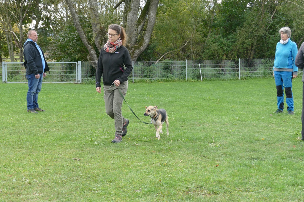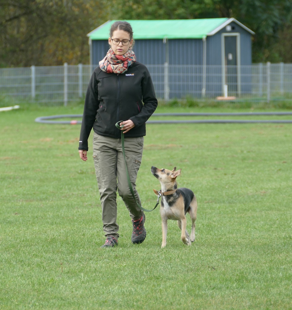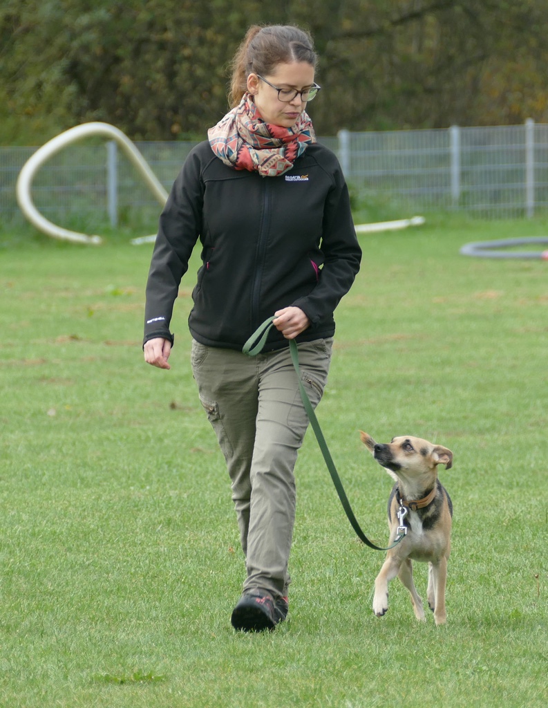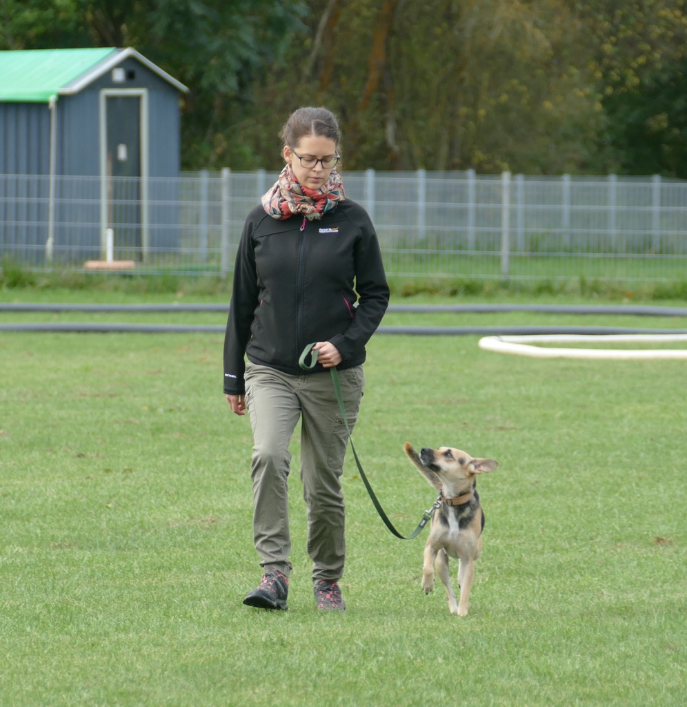 Eine von zwei Gaststarterinnen komplettierte das Team. Andrea und ihre zuckersüße Keela zeigten, was sie gelernt hatten. In der Leinenführigkeit war Keela zuckersüß und himmelte ihr Frauchen ständig an. Die Gruppe wurde freundlich und zurückhaltend begrüßt und dann sehr nett weitergegangen. In der Freifolge war Keela noch aufmerksamer und klettete sich quasi an ihr Frauchen. Das Sitz aus der Bewegung klappte auch aus dem Effeff, aber das Platz aus der Bewegung war nicht Keelas Ding. Sie setzte sich hin und fand das blöd. Der Abruf klappte dann zwar wieder und auch der Vorsitz war super. Auch in der freien Ablage fand Keela es doof und stiefelte ein bisschen rum.