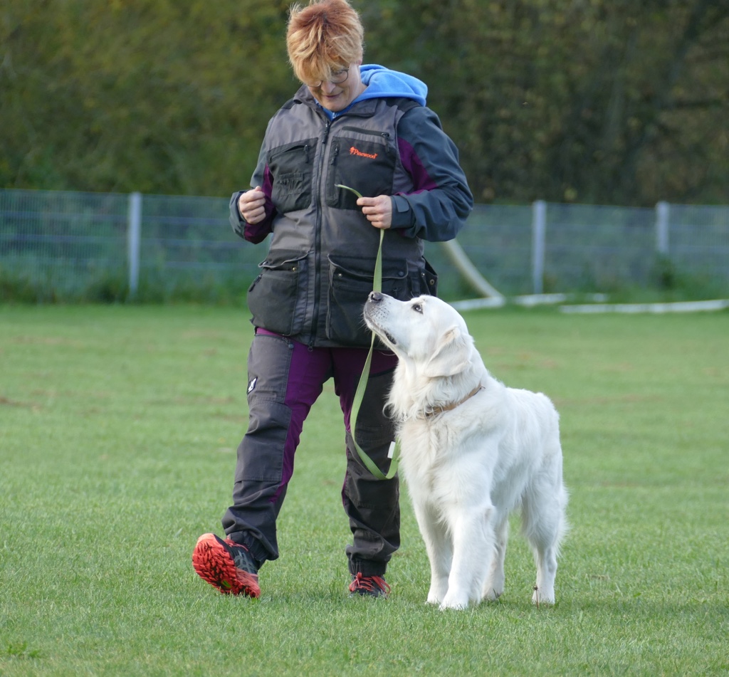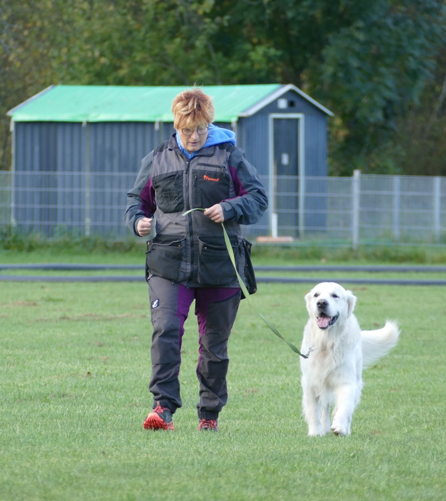 Gaststarterin Silvia mit ihrem Goldie E-Tau rundete mit einem wunderschönen Lauf das Teilnehmerfeld ab. Die beiden agierten als perfekte Einheit und zeigten einfach nur eine großartige Prüfung. Der fröhliche Goldie ließ sich nicht ablenken und hatte den Fokus fest auf sein Frauchen gerichtet. Hätte E-Tau bei der Ablage nicht zwischendurch beschlossen, sich hinzusetzen, hätte er sich den Tagessieger mit Nicola und Odina geteilt. Trotzdem bestanden die beiden den Teil 1 locker und konnten sich erstmal das Mittagessen schmecken lassen, bevor es zum Verkehrsteil ging.