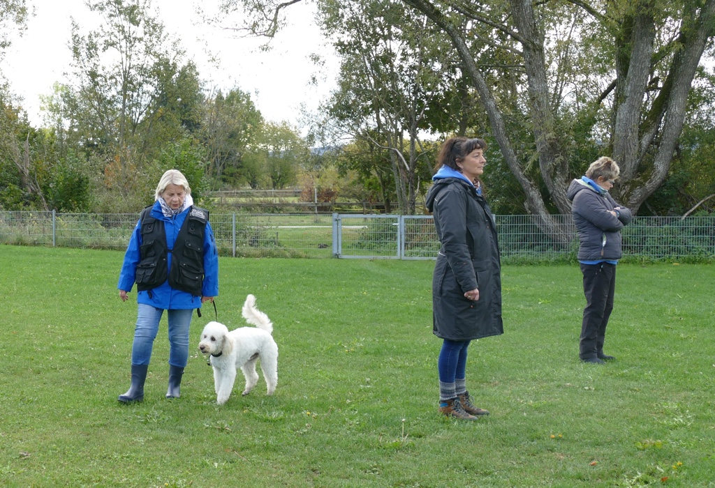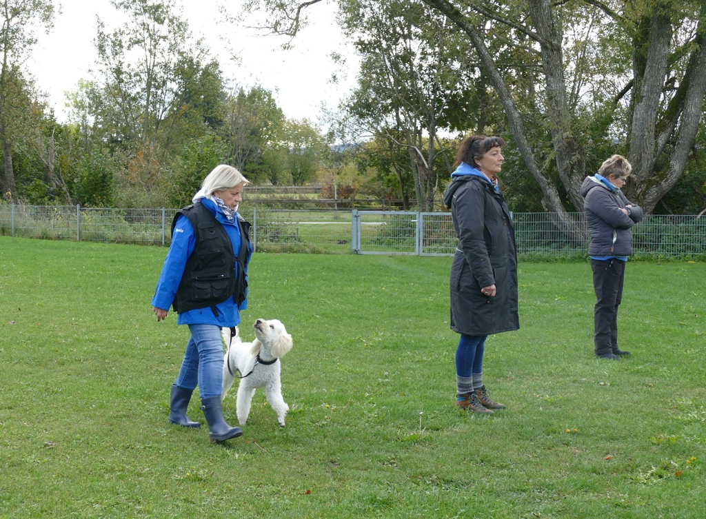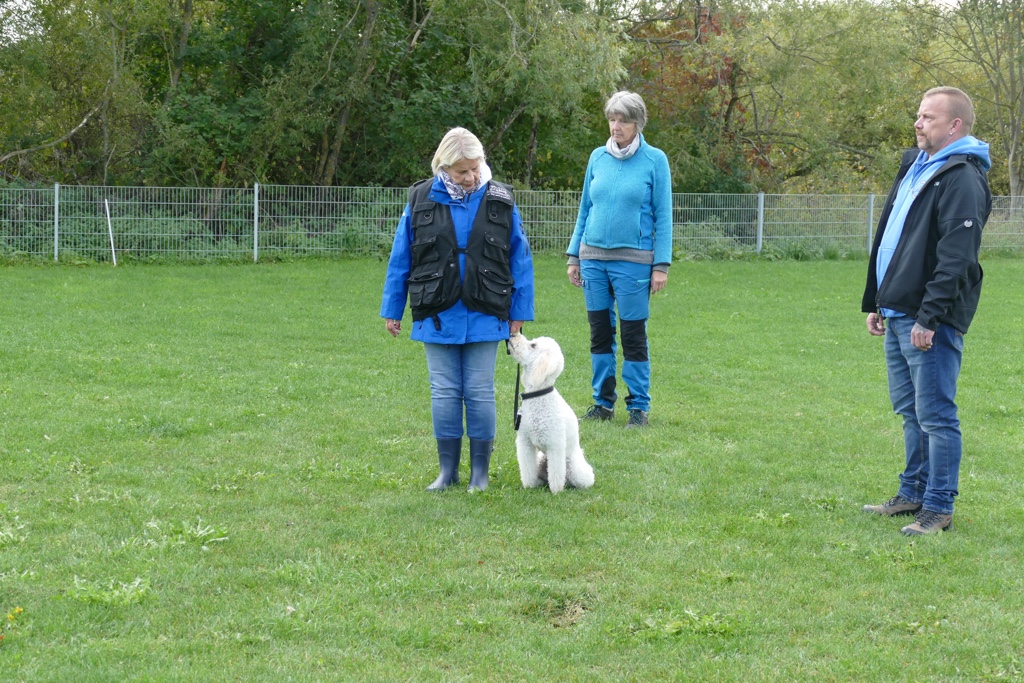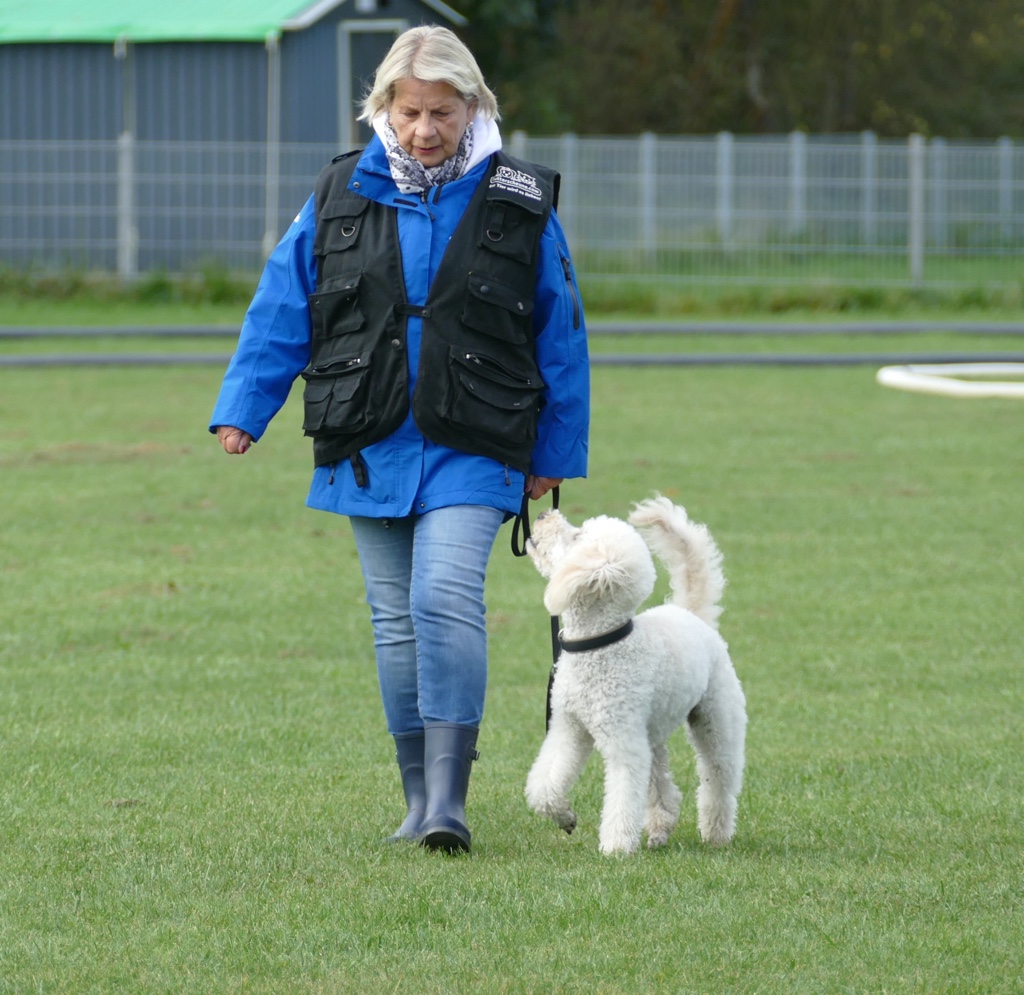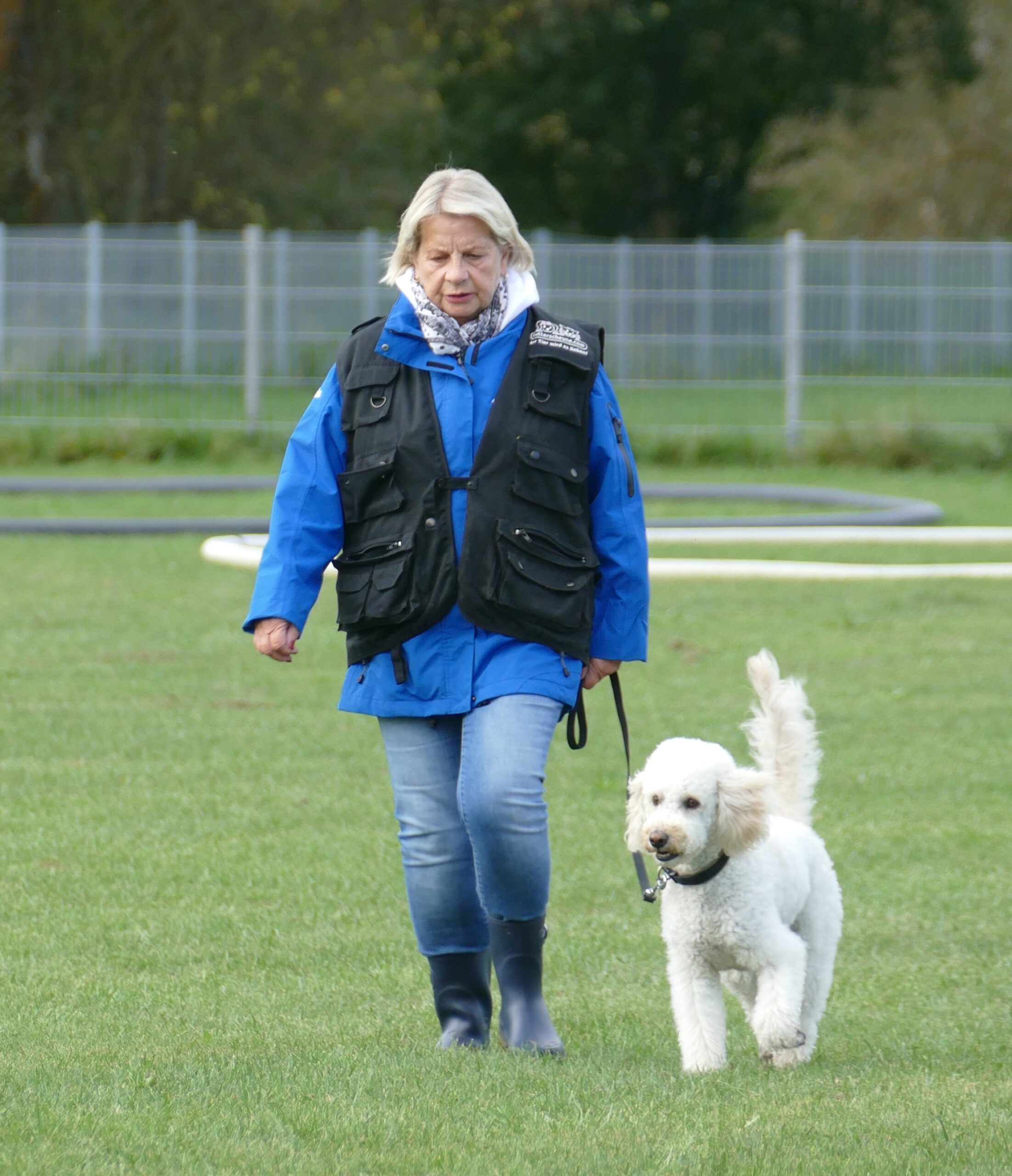 Christa und ihr Pudel Louie waren beide Nervenbündel. Louie pendelte ein bisschen hin und her, war aber sehr aufmerksam und befolgte Kommandos prompt. In der Gruppe legte er sich aus Anspannung kurz hin, kam dann aber sehr schnell wieder zum Frauchen zurück. In der Freifolge lief es für die beiden nicht so perfekt. Louie brauchte ein paar Aufforderungen und war insgesamt gleichzeitig hibbelig und zögerlich. Das Sitz aus der Bewegung fand er doof und legte sich lieber hin. Das Platz aus der Bewegung machte er erst sehr schön, sauste dann aber plötzlich los und wollte sein nervöses Frauchen auflockern und tobte um sie herum. Nachdem die freie Ablage perfekt war, hieß es auch für diese beiden: „Der Verkehrsteil muss bombe laufen.“