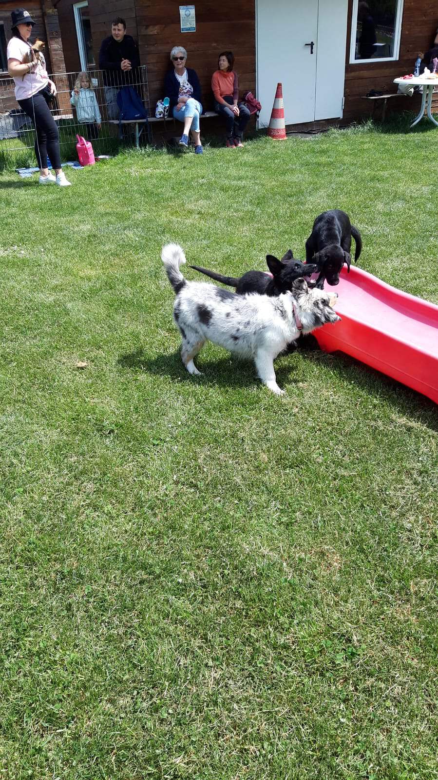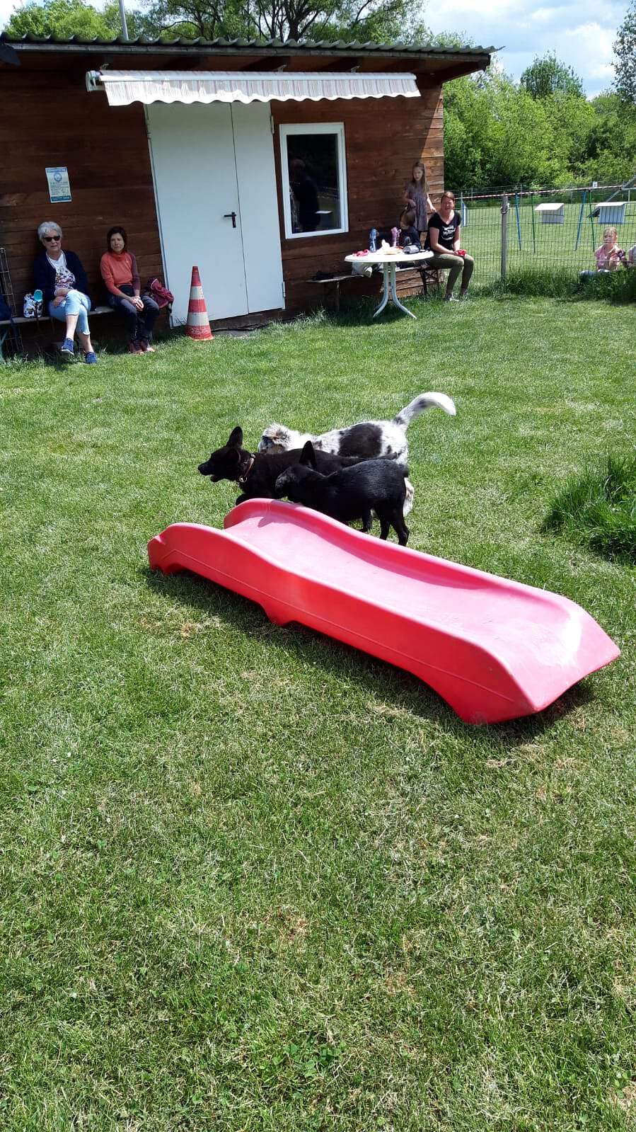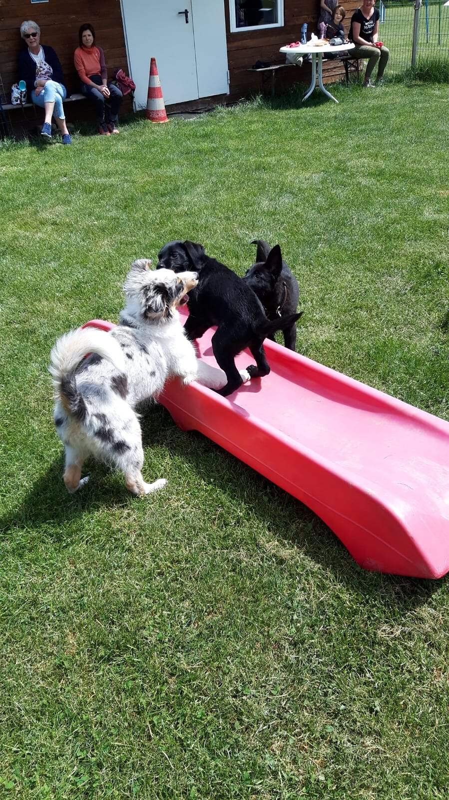 Wenn unser Welpengelände nicht gerade durch unsere kleinsten belagert war, zeigt hier die Spiel- und Spaßgruppe, was jeder Hund so machen kann. Das geht über verschiedene Suchspiele, Fly Ball und Doc Dance-Übungen bis hin zu Apportierübungen. Alles mit dem Ziel, den Hund artgerecht und mit viel Freude und Bindungsarbeit auszulasten. Heike ist sehr kreativ und hat für jeden Hund das perfekte Hobby parat. Hier herrschte reger Andrang und mit viel Begeisterung wurden viele Intelligenzspiele ausprobiert oder ein kleiner Parcours durchlaufen.