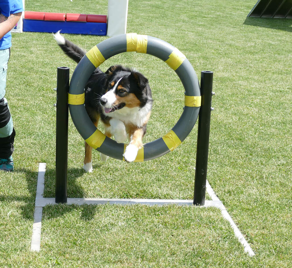 Direkt daneben hatte die Agilitygruppe einen nicht abreißenden Strom von potentiellen neuen Teams. Es dürfte jeder einmal ausprobieren, was ihn so interessiert hat. So wurde die A-Wand mit viel Schwung überquert und als kleines Lockmittel mal ein Ball verwendet oder der Steg mit Leckerlie-Unterstützung bewältigt. Ein schüchternes Pudelmädchen wollte den Tunnel nicht durchlaufen, also ist das Frauchen einfach vorausgekrabbelt und schon war das Hundemädchen auch bereit für den Spaß. Viele Hunde waren schon nach kürzester Zeit bereit auch einen kleinen Parcours zu absolvieren und nach den strahlenden Gesichtern von Hund und Mensch haben nicht wenige Feuer für diesen Sport gefangen. Die verschiedenen Sprungkombinationen waren für alle interessant, denn der Reifen ist eine spezielle Herausforderung und wurde von nahezu allen Hunden im zweiten Anlauf problemlos bewältigt. Manche waren gleich auf Anhieb durch.