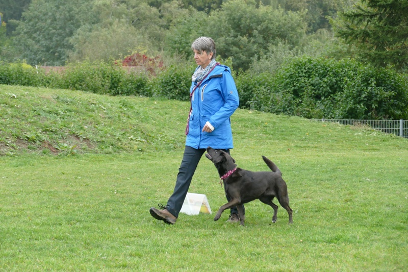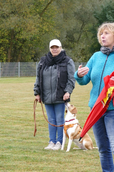Die Teilnehmer bekamen jeder ein Punktekärtchen und durfte sich dann auf den Weg machen. Unsere Teams hatten sich über das gesamte Gelände verteilt, so dass jeder genug Platz um sich herum hatte, um sich voll und ganz auf seinen Hund und die momentane Aufgabe zu kümmern. Erst waren kleine Hindernisläufe zu absolvieren, die für Jederhund möglich waren. Dann kam das Hütchen-Spiel. Der Mensch und zwei Helfer versteckten sich unter Bettlaken, vertauschten ihre Position und gingen in die Hocke. Der Hund musste nun seinen Menschen finden. Die meisten Hunde stürmten ihren Menschen regelrecht über den Haufen. Die feine Nase lässt sich nicht so leicht täuschen. Beim Schätzspiel wurden dem Hund Käse, Leckerchen und Nassfutter angeboten und der Mensch musste die Schätzung abgeben, auf welche dargebotene Leckerei der Hund wohl zuerst abfahren würde. Insgesamt waren es sechs sehr verschiedene Spiele, die wie vorbereitet hatten und die sehr gerne angenommen wurden.