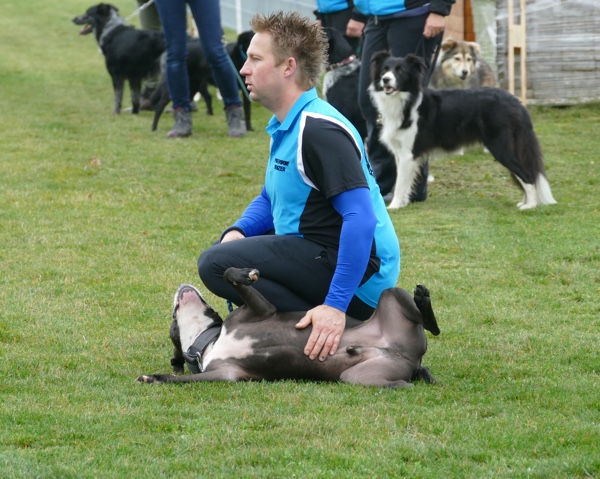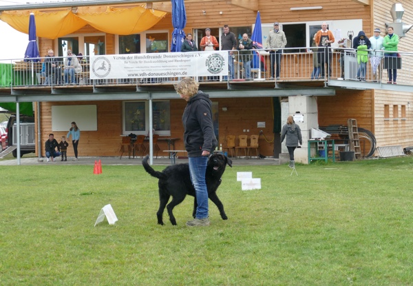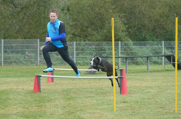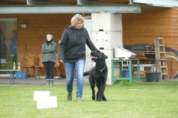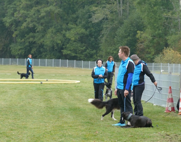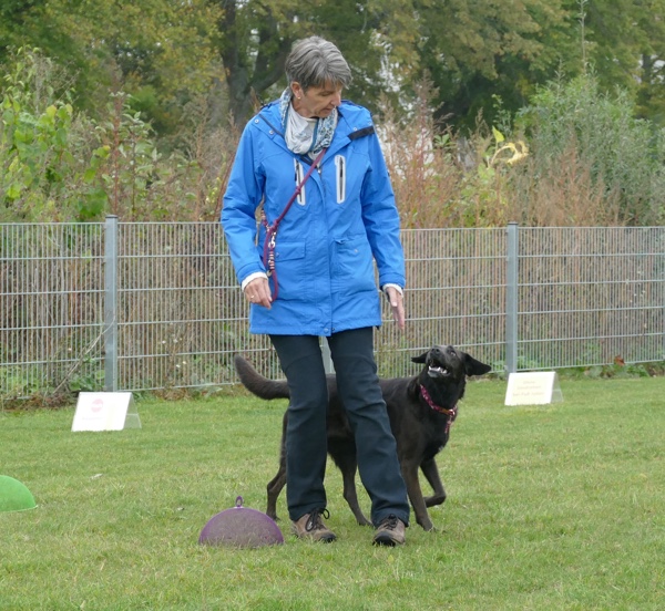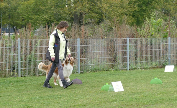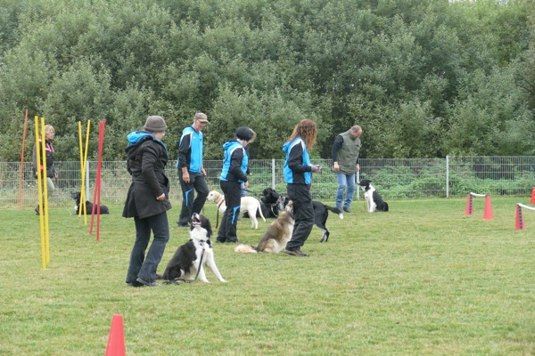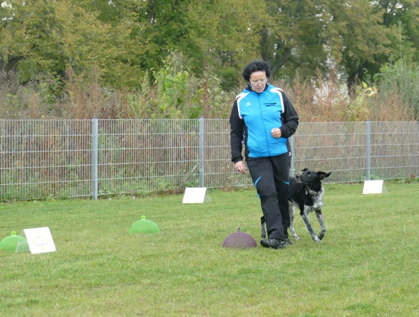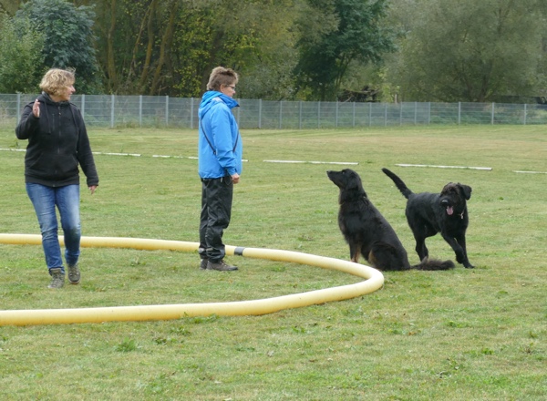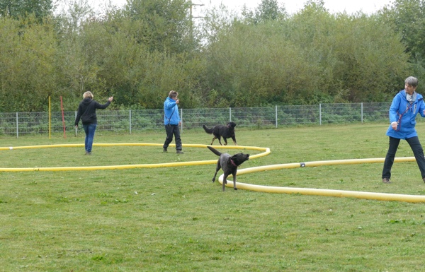 Nun durften auch die Besucherhunde etwas machen. Wir hatten uns mehrere lustige Spiele ausgedacht, die in Form einer kleine Rallye absolviert wurden. War eine Station besetzt, konnte man gleich weiter zur nächsten und die vorherige Station eben später nachholen. Mit viel Spaß und Begeisterung kamen die vormaligen Zuschauer nun voll auf ihre Kosten und durften zum Beispiel schätzen, welches Leckerchen ihr Hund nun wohl zuerst nehmen würde, ob er sein Herrchen/Frauchen schnell zwischen drei vermummten Personen rausfinden würde oder ob er sich über verschiedene Hindernisse locken lassen würde.