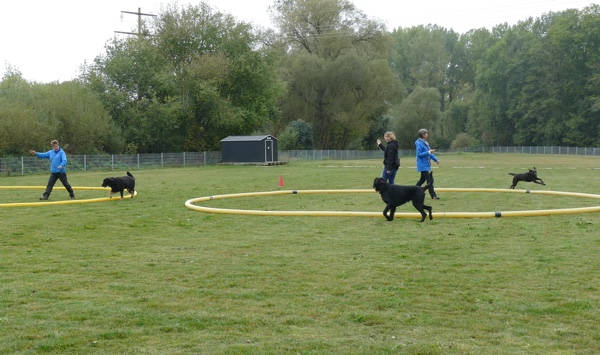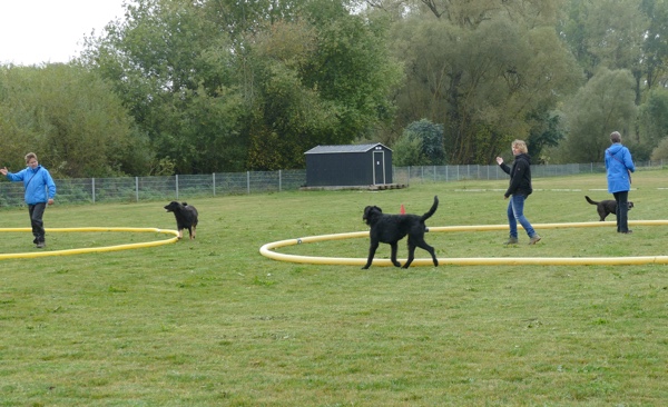 Nun ging es weiter zum Longieren und dort konnte die Gruppe gleich viele bewunderte Blicke auf sich ziehen, da die Hunde total entspannt aneinander vorbei oder miteinander um die Ringe kreisten. Trotz der großen Ablenkung der Zuschauer und der Zuschauerhunde blieben sie konzentriert am Ring und vollführten in hohem Tempo koordinativ die schwierigsten Übungen. Über Sprünge, durch Tunnel, Begegnungen mit den unterschiedlichsten Hunden, sich gegenseitig umkreisen oder um Pylonen, alles stellte kein Problem für die Longiergruppe dar. Longieren ist eine tolle Möglichkeit die Kommunikation und Bindung zwischen Hund und Mensch zu verbessern und zu vertiefen. Es ist für nahezu jeden Hund geeignet und bietet sich auch für die Rehabilitation nach einer Verletzung an. Durch die leichte und lockere Bewegung, die dem Bewegungsapparat des Hundes entgegenkommt und ihn kopfmäßig gut auslastet, kann auch ein Hund, der sonst vielleicht nicht viel Gassi gehen darf, seine Muskeln auslasten und wird auch nicht unruhig, weil er gerne etwas mehr machen möchte.